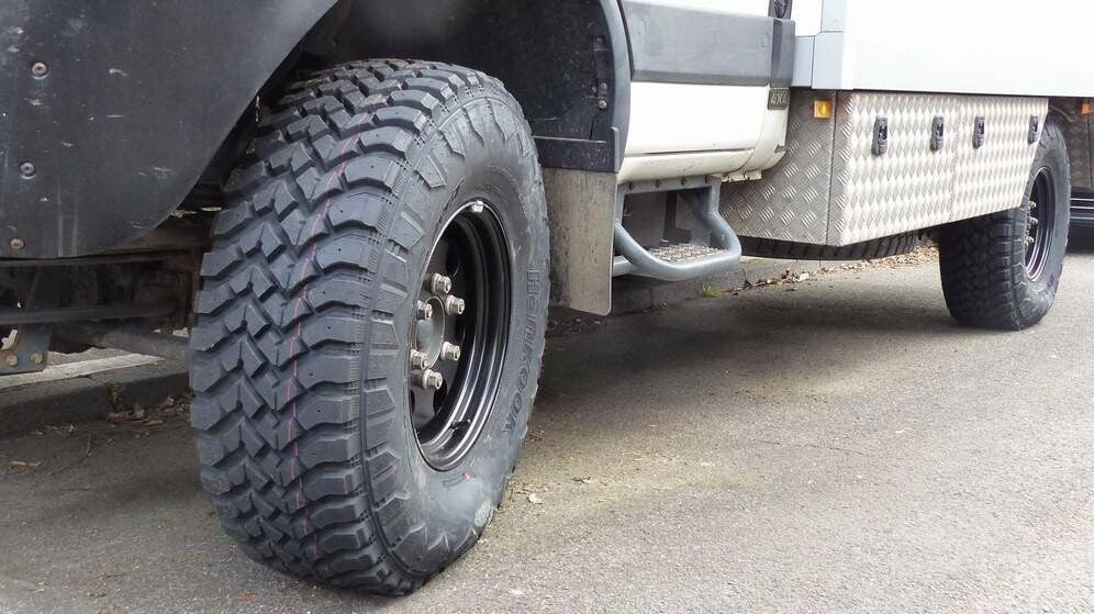 Kaum Zuhause angekommen, machten wir uns auf die Suche nach vernünftigen und ansehnlichen Felgen mit Reifen. Dabei wurden wir bei einer australischen Firma fündig und bestellten einen Satz 17x9“ Stahlfelgen mit den dazugehörigen 37“x12,5“ R17 MT Reifen. Da diese Räder allerdings eine längere Schiffsreise vor sich hatten dauerte es weitere 10 Wochen, bis wir sie endlich auf den Iveco montieren konnten. Die Gesamtansicht des Fahrzeuges entschädigte dann aber doch für das lange Warten. Zudem hoben wir das gesamte Fahrwerk um weitere 20mm an.