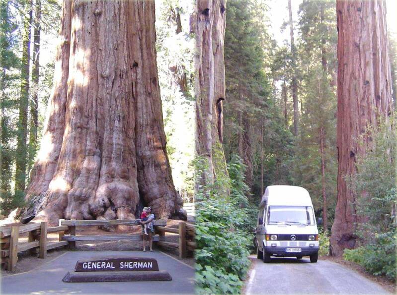 Direkt an den Yosemite NP grenzt der „Sequoia und Kings Canyon NP“. Auch hier fahren wir durch atemberaubende Landschaften – und mit dem Motorrad macht es noch mehr Spaß. Doch das Highlight sind die Sequoias, die Mammutbäume. Bei der Fahrt durch den „Giant Forrest“, der vor über 150 Jahren von den damaligen Siedlern bereits sehr stark dezimiert wurde, kommen wir am größten dieser Bäume vorbei. Er heißt General Sherman Tree, ist 84m hoch, hat einen Umfang von 31m und könnte bis zu 4.000 Jahre alt werden. Ehrfürchtig stehen wir vor dem Baum, der als das größtes Lebewesen der Erde gilt.
