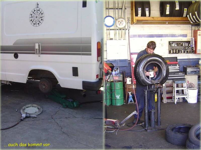 Schon seit Tagen verlieren wir ständig hinten links Luft. Da kommen wir an einer fachmännischen Reparatur natürlich nicht mehr vorbei. Ein rostiger Nagel hatte es sich in unserem Hinterreifen bequem gemacht – das diesjährige Opfer für den Gott der Reisenden ;-)