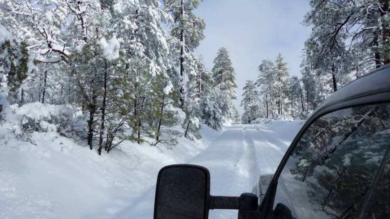 Am darauffolgenden Tag treffen wir unseren Freund Steve. Mit seinem 4x4 Truck nimmt er uns mit in den "National Forest" von Prescott. Es ist beeindruckend, wie sicher er das Fahrzeug durch den verschneiten Winterwald manövriert. An einem geeigneten Platz packt Steve eine kleine Sammlung seiner Spielzeuge aus – naja, ihr wisst ja was jetzt kommt.