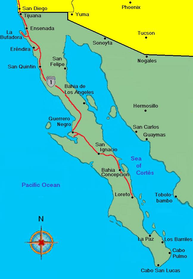 Vor uns liegt jetzt die „Baja California“. Eine knapp 1.300km lange Halbinsel, die sich parallel zum mexikanischen Festland nach Süden-Osten erstreckt. Dazwischen befindet sich die „Sea of Cortés“. Anders als auf unseren vorherigen Reisen 2004 und 2005, als wir jeweils von La Paz aus auf das Festland übersetzten, wollen wir „Niederkalifornien“ diesmal in beide Richtungen bereisen.