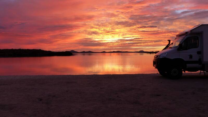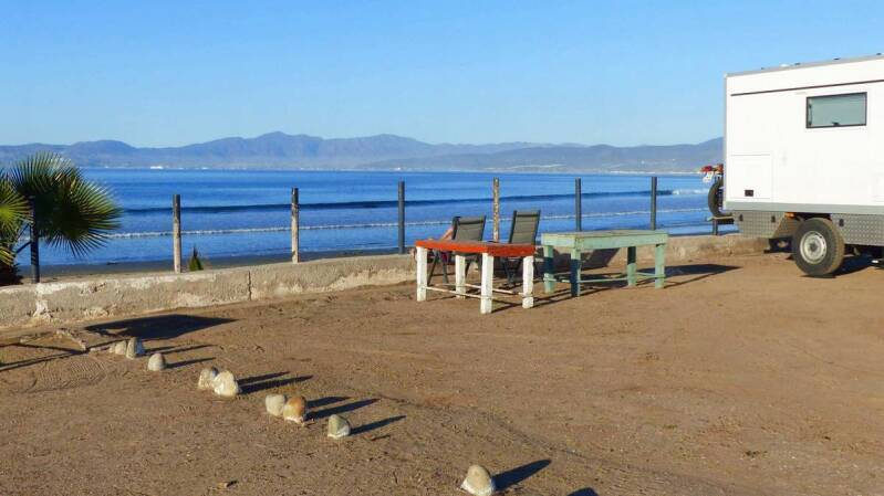 Während unserer Reise auf der zweitgrößten Halbinsel der Welt, ist es äußerst schwierig, bereits besuchte Plätze nicht wieder anzusteuern. Doch an der 70km langen „Bahia Concepcion“ ist uns dies gelungen. Entlang dieser traumhaften Bucht gibt es unzählige Strände, an denen wir es ewig aushalten könnten. Zwar sind viele s.g. „Snowbirds“ da, amerikanische und kanadische Rentner die hier überwintern, doch die konzentrieren sich hauptsächlich auf die etwas einfach zu erreichenden Strände. Von unseren Stellplätzen aus, lassen sich vielfach auch vorbeiziehende Delfine beobachten.
