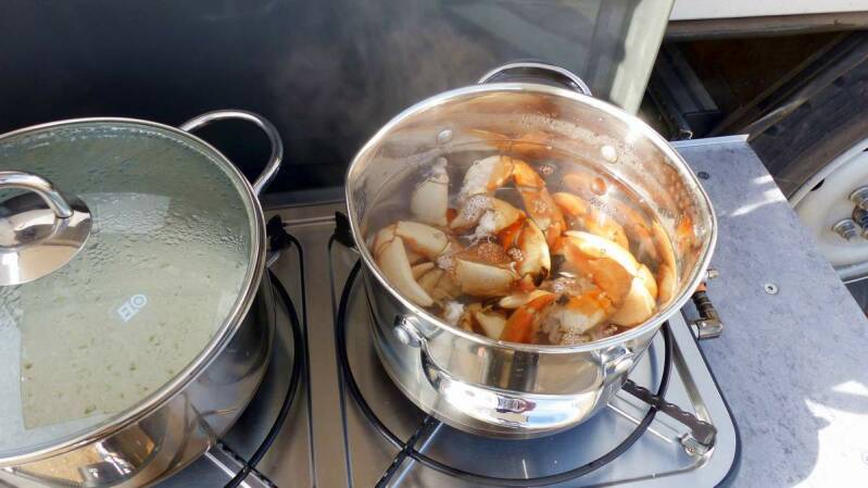 Am nächsten Morgen erstehen wir von einem Fischer für ein paar wenige Pesos fangfrische Krabbenbeine. Allerdings geht dem Genuss des leckeren Krabbenfleisches noch eine ordentliche Portion an Arbeit mit Hammer und Zange voraus.