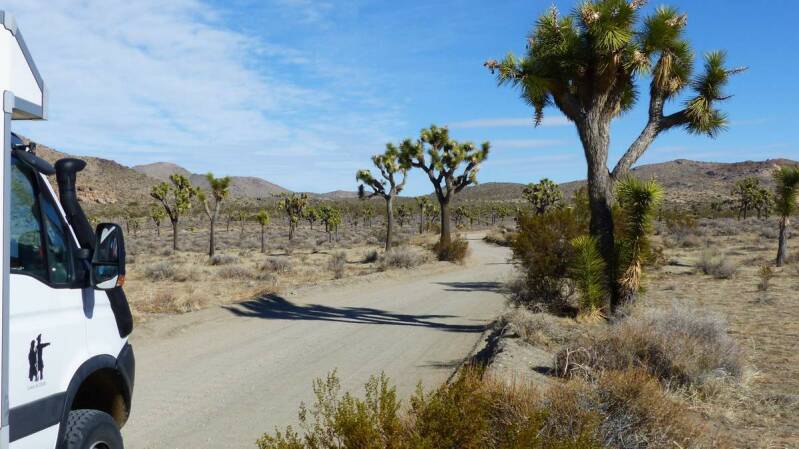 Unser nächstes Ziel ist das „Mojave National Preserve“, ein Naturschutzgebiet inmitten der Mojave Wüste. Damit hätten wir auf dieser Reise, neben der „Chihuahua Desert“ und der „Sonoran Desert“, die letzte der drei großen Wüsten im Südwesten der USA bereist. Jede dieser Wüsten verfügt über eine eigene Vielfalt an Tieren und Pflanzen. In der Mojave Wüste sind es hauptsächlich die verschieden Arten an Palmlilien – allen voran, der Joshua Tree. Hier verbringen wir mehrere Tage. Wir besteigen eine der höchsten Wanderdünen im Südwesten der USA, die „Kelso Dunes“ und wandern auf Lava Flüssen, die seit Millionen von Jahren erstarrt sind. Um die etwas abgelegenen Stellplätze, das s.g. Backcountry Camping, erreichen zu können, legen wir wieder viele Kilometer auf unbefestigten Pisten zurück.