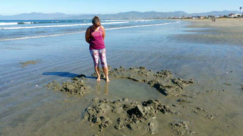 Ein kleines Stück weiter beziehen wir Quartier auf einem Campingplatz unmittelbar am Strand – nicht ohne Grund. Bei tiefster Ebbe, wenn also der Meeresspiegel seinen tiefsten Stand erreicht hat, gibt es entlang des Strandes warme Flecken. Wenn man nun an diesen Flecken etwas im Sand buddelt, füllen sich die Löcher mit heißem Wasser aus den darunterliegenden heißen Quellen – irre.