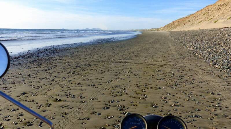 Unser nächstes Ziel ist die „Bahia Santa Maria“, südlich von San Quintin. Diese Bucht kennen wir noch von unseren früheren Reisen. In den heißen Sommermonaten ist sie ein herrliches Badeparadies. Hier lässt sich aber auch der menschenleere Strand mit dem Motorrad ohne Probleme über die gesamte Länge der Bucht abfahren.