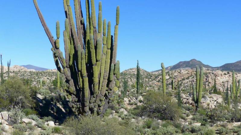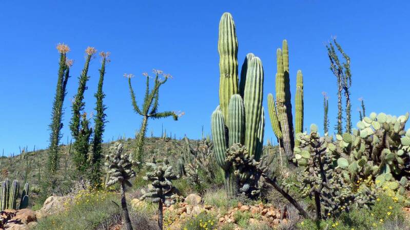 Wieder zurück auf der „Mex1“ beginnt ab hier die eigentliche Schönheit und Vielfalt der Baja California. Über hunderte von Kilometern säumen nun die unterschiedlichsten Kakteen und Palmlilien, die durch vulkanische Aktivitäten entstandenen Berge und Hänge. Viele davon sind endemisch, kommen also nur hier vor. Dazwischen immer wieder große Teppiche von blühenden Blumen, bedingt durch die reichhaltigen Niederschläge des vergangenen Monats.