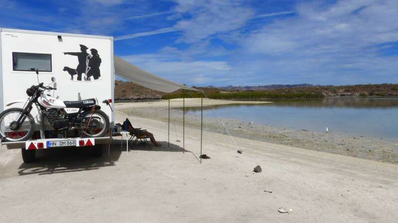 Nachdem wir kurz vor Guerrero Negro die Grenze nach „Baja California Süd“ überfahren haben, erreichen wir die „Laguna Ojo de Liebre“. Diese Bucht ist Teil eines riesigen Naturschutzgebietes, in der von Januar bis März Grauwale ihre Jungen gebären. Dort lernen wir Uschi und Hermann aus Bayern kennen, die mit ihrem Sprinter unterwegs sind. Schnell entsteht ein nettes und angeregtes Gespräch mit den Beiden und es werden reichlich Reiseerfahrungen ausgetauscht – die Reiseerlebnisse der Beiden könnt ihr unter www.rallhu.de nachlesen.