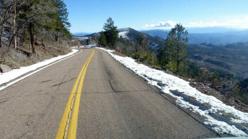 Unser letzter Bericht endet im vorweihnachtlichen Albuquerque. Von dort geht es jetzt in südlicher Richtung nochmals dem "Rio Grande" entlang. In Socorro verabschieden wir uns aber endgültig von dem Fluss, der seinen Namen eigentlich gar nicht mehr verdient und fahren gen Westen – zurück nach Arizona. Kaum über der Grenze, in Springerville, beginnt ein etwa 220km langer und kurvenreicher „National Scenic Byway“, der uns nun mehrfach auf über 3.000 Höhenmeter führt. Das Wetter ist herrlich und so können wir die Fahrt durch diese alpine Region in vollen Zügen genießen. Entlang der Panoramastraße gibt es zahlreiche freie Stellmöglichkeiten, an denen selbst das Feuerholz von den Rangern zur Verfügung gestellt wird.