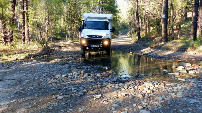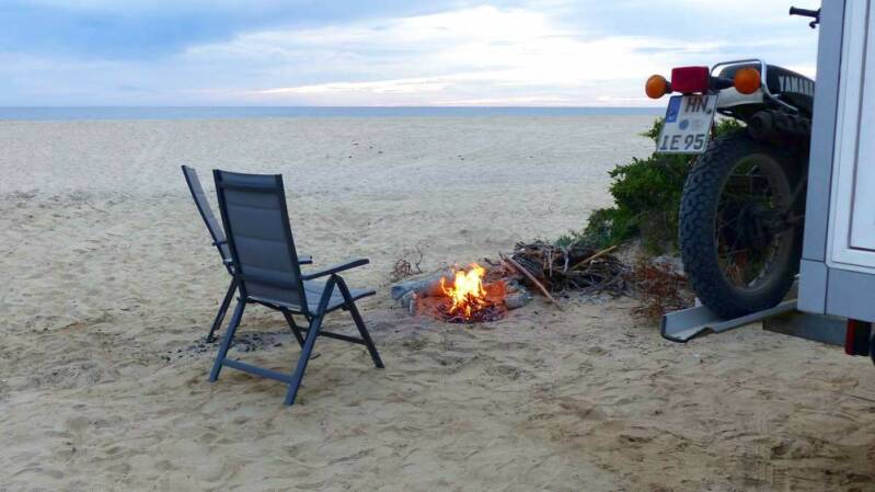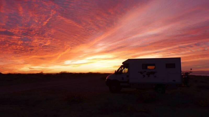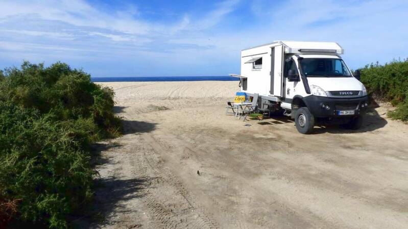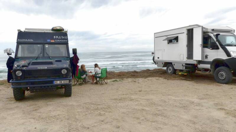 Urplötzlich taucht ein weiterer deutscher Iveco neben uns auf. Ein junges Paar aus Aachen hat unseren Camper entdeckt und schaut kurz vorbei, um mal eben Hallo zu sagen. Sofort beginnt ein reger Erfahrungsaustausch über das woher und wohin – zu der Zeit natürlich noch unter grober Missachtung des Mindestabstandes.