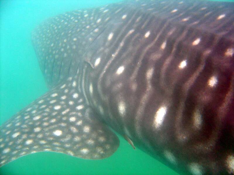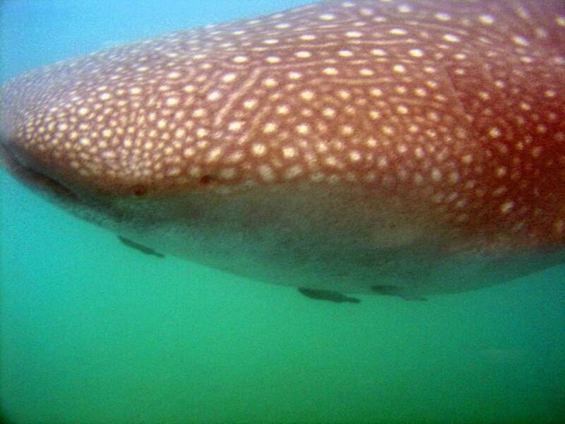 Unser nächstes Ziel ist noch einmal La Paz. Um diese Jahreszeit tummeln sich in der großen Bucht vor der Stadt immer sehr viele Walhaie. Diese wollen wir natürlich auch sehen. Da die Bucht wie die Tiere selbst unter dem Schutz des Nationalparks stehen, darf nur eine bestimmte Anzahl an Booten rausfahren. Wir haben das große Glück, ein Boot nur für uns alleine zu haben. Schon nach wenigen Minuten sehen wir mehrere der gemütlich dahingleitenden Planktonfresser aus nächster Nähe. Zu einem geeigneten Zeitpunkt springen wir ins Wasser und können so mit den größten Haien der Weltmeere mit schnorcheln. Da das Wasser in der relativ flachen Bucht äußerst planktonreich ist, leidet natürlich die Sicht sowie die Qualität der Bilder etwas darunter.