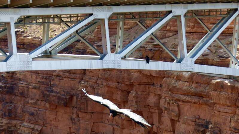 Während unserer Weiterfahrt überqueren wir den Colorado auf der „Navajo Bridge“. Dort haben wir das große Glück, mehrere der seltenen und zweitgrößten fliegenden Vögel der Wert, die kalifornischen Kondore beobachten zu können.
