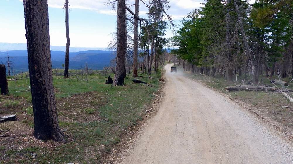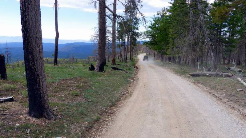 Das „Mogollon Rim“ nördlich von Payson, soll nach der Zwangspause unser erstes Ziel sein. Dieser Gebirgszug ist die südwest-lichste Begrenzung des ersten Colorado Massivs. Es erhebt sich bis auf 2.200m Höhe und an den Wochenenden sucht halb Phoenix hier oben Abkühlung. Die ersten vier Tage begleiten uns Sandra und Don mit ihrem Camper und ihrem Jeep. Wir genießen die Stille und die Abgeschiedenheit hier oben in den kühlen Wäldern. Das Highlight ist allerdings die ca. 75km lange Fahrt entlang der steil abfallenden Gebirgsklippe auf unbefestigtem Untergrund.