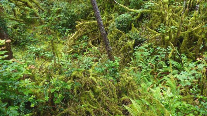 Auch im „Cascade Siskiyou NM“, jetzt bereits in Oregon, hat sich das Wetter nicht wesentlich gebessert. Hier oben, wo der gemäßigte, pazifische Regenwald beginnt, macht dieser seinem Namen alle Ehren. Üppig hängt das „spanische Moos“ von den Bäumen. Ebenso sind die Stämme, Äste und der Boden reichlich mit Moos bedeckt. Die gesamte Natur steht in einem satten Grün – klar, bei über 300 Regentagen im Jahr.