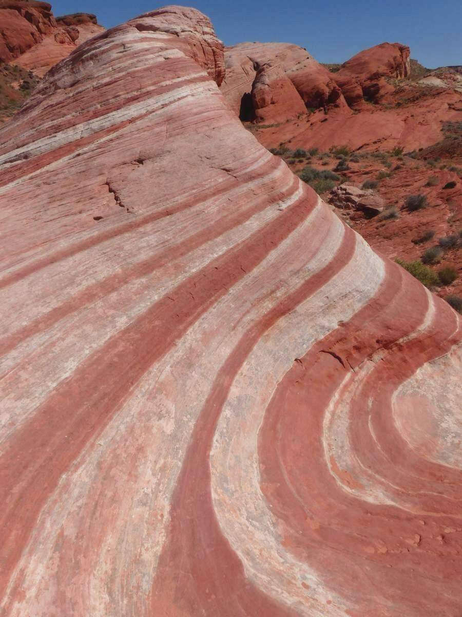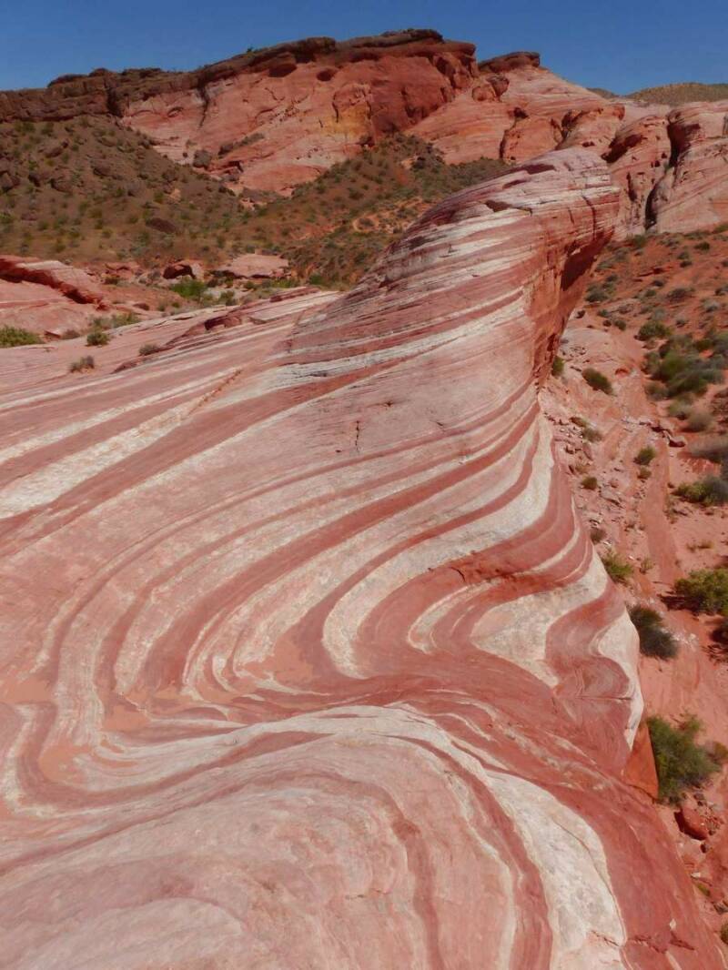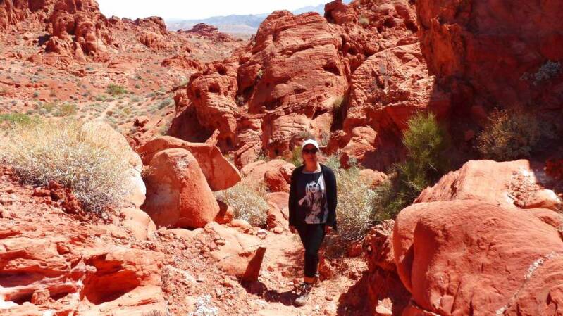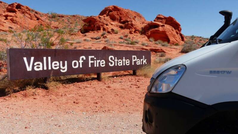 Für ein paar Tage verweilen wir noch in den kühleren Regionen des Grenzgebietes zwischen Arizona, Utah und Nevada. Als nächstes fahren wir in das „Valley of Fire“, nördlich von Las Vegas. Die ultimative Spielermetropole inmitten der Wüste Nevadas lassen wir dieses Mal aus, da wir auch hier schon mehrfach waren. Anhand der Bilder erkennt ihr sicherlich, wie das „Tal des Feuers“ zu seinem Namen kam. Das rote Sandsteingebirge und die schroffen Felsformationen scheinen in der Sonne regelrecht zu brennen. Wir unternehmen mehrere Wanderungen, wovon uns eine davon zu der „Little Wave – die kleine Welle“ führt. Dort wurden die unterschiedlichen Bodenschichten in Jahrtausenden durch Erosion und Wettereinflüsse so geformt, dass für den Betrachter das Bild einer Welle entsteht.