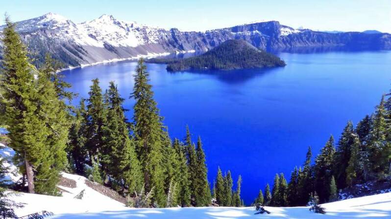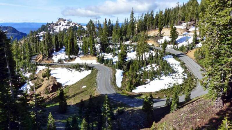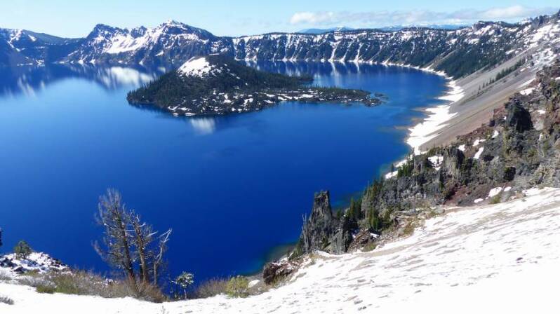 Mehr Glück haben wir dann im „Crater Lake NP“. War noch tags zuvor vom Kraterrand aus nicht mal die Hand vor Augen zu erkennen, zeigt sich heute der tiefblaue Kratersee mit der darin liegenden Insel von seiner aller schönsten Seite. Der zuletzt vor ca. 6.000 Jahren explodierte Vulkan „Mt. Mazama“ schleuderte dabei fast 1.600m seiner ursprünglichen Höhe weg und hinterließ einen 80km² großen und knapp 600m tiefen Kratersee. Er ist damit der tiefste Frischwassersee der USA. Leider sind auch hier oben, wegen der noch winterlichen Wetterverhältnisse, viele Straßen und Wanderwege gesperrt. Doch das was wir zu sehen bekommen ist einfach nur traumhaft schön.