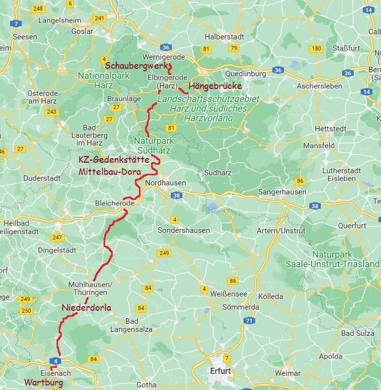 Nach drei sehr schönen und informativen Tagen verlassen wir das Camp der Abenteuer & Allrad wieder. Wir wollen mit Sandra und Don durch den Thüringer Wald in den Harz reisen und dabei Don die deutsche Geschichte dieser Region etwas näher bringen.