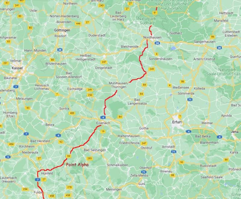 Auf der Rückfahrt fahren wir noch bei Geisa an der Mahn- und Gedenkstätte Point Alpha vorbei. Dabei handelt es sich um einen von vier amerikanischen Beobachtungstürmen an der ehemals hessischen innerdeutschen Grenze. Auf dem weitläufigen Gelände wird neben den Wachtürmen beider Seiten u.a. auch ein Stück Todesstreifen mit Wachhunden dargestellt. Unweit davon befindet sich das "Grenzmuseum", durch dessen Räumlichkeiten die ehemalige "Zonengrenze" verlief.