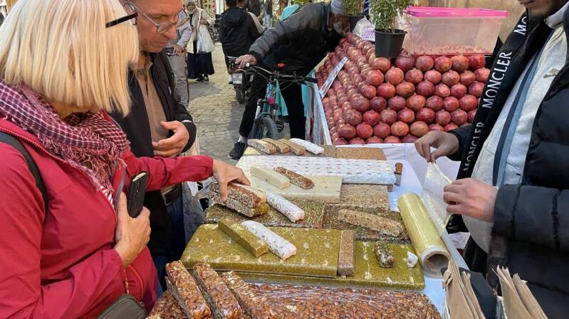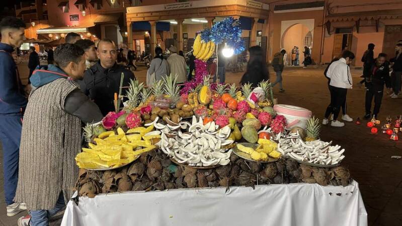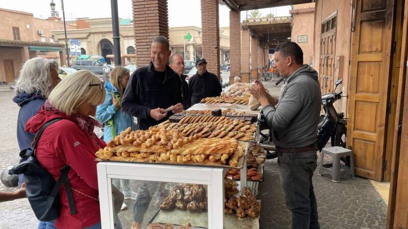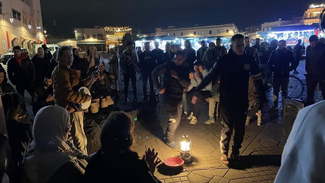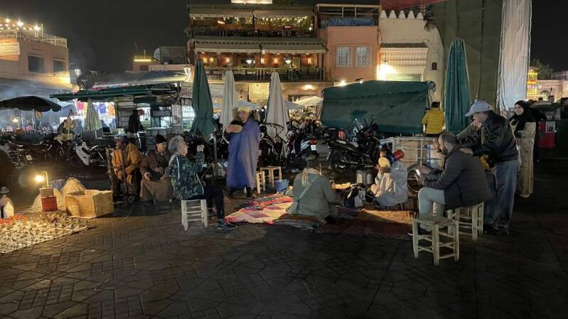 Am Abend verwandelt sich dann der zentrale Marktplatz "Djemaa el Fna" in eine große "Open Air" Veranstaltungsarena. Es herrscht wildes Treiben mit Schlangenbeschwörern und Gauklern sowie Wahrsagerinnen und Künstlern aller Art. Uns begeistern jedoch am meisten die kleinen Gruppen von Musikern, die mit traditioneller Musik die Zuschauer in ihren Bann ziehen. Rund um den Platz befinden sich viele Verkaufsstände und Restaurants, die die kulinarischen Spezialitäten des Landes anbieten – auch wir machen natürlich reichlich Gebrauch davon.