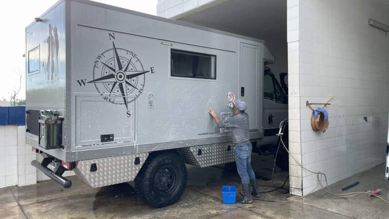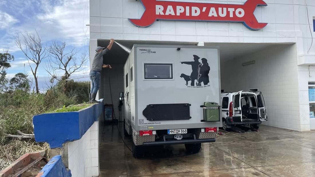 Bevor wir nun in Richtung Fähre fahren, wollen wir noch den ganzen Sand und Staub der letzten Wochen vom Iveco waschen. Dafür suchen wir eine entsprechend passende Waschanlage aus, die das für uns übernehmen.