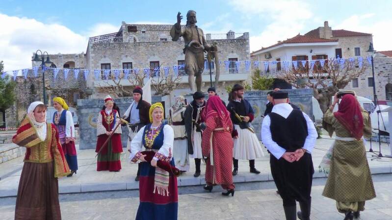 Ebenso war es der Ausgangspunkt für die griechischen Revolution von 1821–1829 gegen die Herrschaft der Osmanen. Uns fällt auf, dass sehr viele Gruppen in Trachten, ob jung oder alt, sich auf dem zentralen Platz formieren. Nachfragen ergeben, dass diese Gruppen zum Anlass des Nationalfeiertags am 25.03. für die anstehende Parade üben. Von einem Cafe aus schauen wir uns das bunte Treiben bei lautstarker traditioneller Musik an und genießen dabei einen "Frappe" (ein kalter griechischer Kaffee).