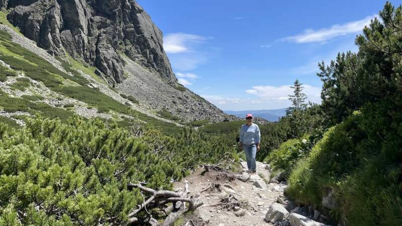 Unser erstes Ziel in der Hohen Tatra ist eine Wanderung zu dem "Schleierwasserfall" (Obrovsky Vodapad). Dafür fahren wir mit der S-Bahn in den Wintersportort mit dem schier unaussprechlichen Namen Strbske Pleso. Der Ort selbst quillt über mit Touristen – klar, es ist Hauptreisezeit. Schon in wenigen Wochen, wenn der erste Schnee oben fällt, ist die Sommer Saison allerdings schon wieder beendet. Wir sehen zu, dass wir den Trubel so schnell wie möglich hinter uns lassen. Vorbei an den Skischanzen beginnt der eigentliche Trail. Nachdem wir auch die Baumgrenze überschritten haben, ist die Anzahl der Tourengeher wieder überschaubar. Wir werden schon während des Aufstiegs wie auch am Wasserfall selbst mit einem tollen Bergpanorama belohnt.