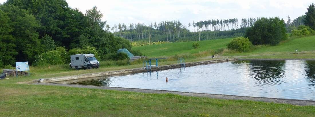 Einen weiteren wunderschönen Übernachtungsplatz finden wir an einem Waldrand bei Chlistov. Das Beste daran ist das "Naturschwimmbecken" daneben. Da es am Abend noch sehr warm ist, ist der Sprung ins kühle Nass eine wahre Wohltat.