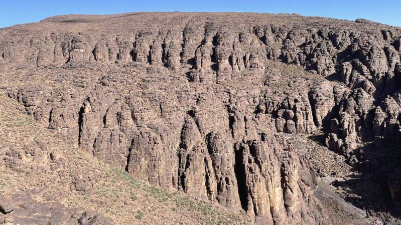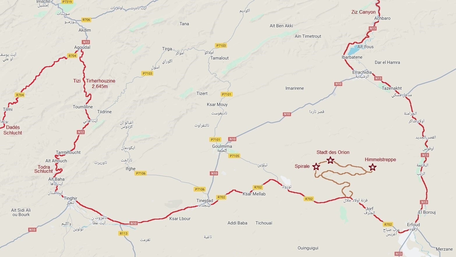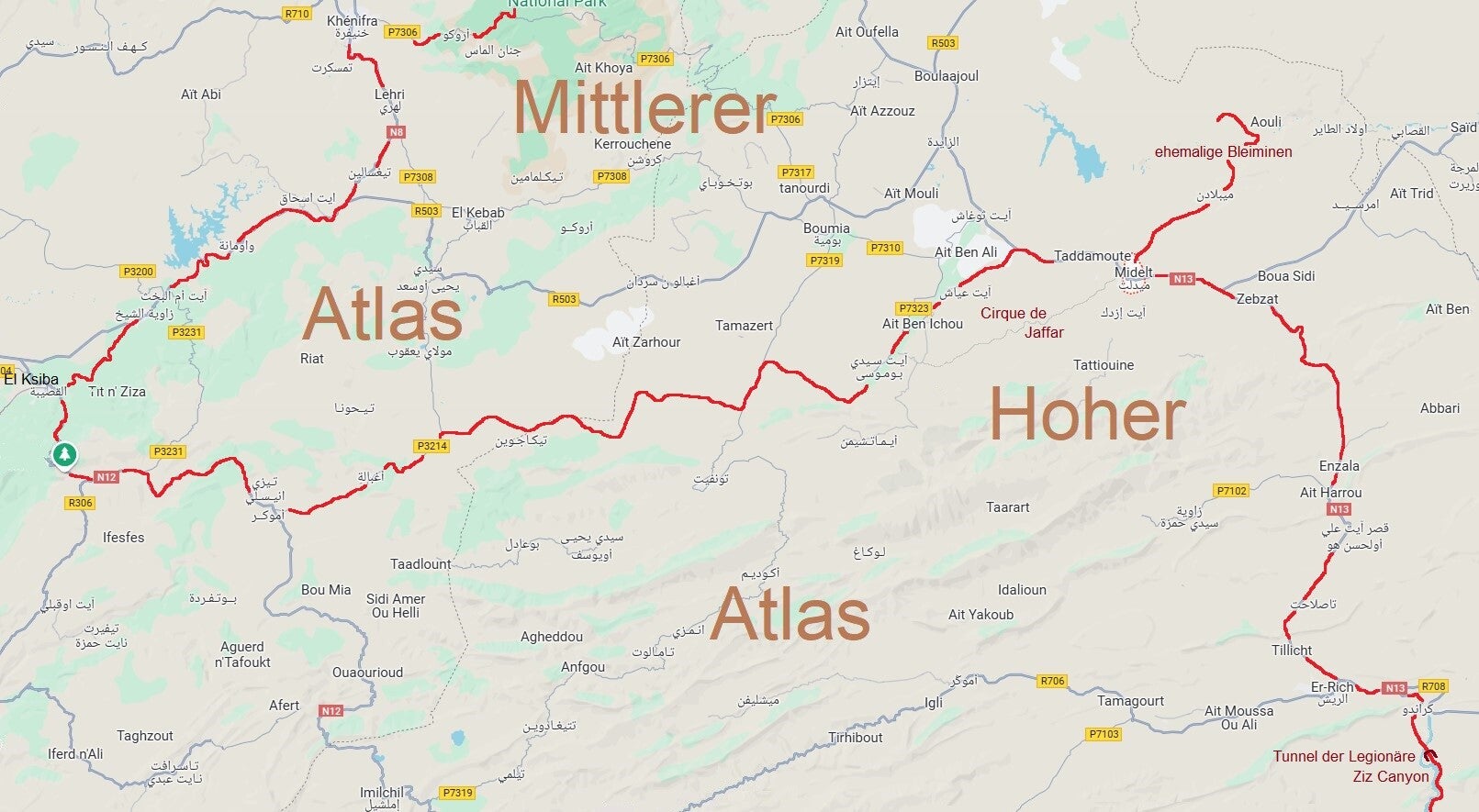 Immer entlang der Talsohle des „Mittleren Atlas“, erreichen wir den netten Ort El Ksiba. Nach einer Stärkung auf dem dortigen Food-Court, folgen wir der Straße über die südlichen Ausläufer diese Gebirgszuges. Was wir jetzt an Landschaft präsentiert bekommen, ist einfach nur wunderschön. Zu Beginn sind die Straßenverhältnisse eigentlich noch ganz ok. Doch so nach und nach werden diese immer einfacher, bis irgendwann dann nur noch Schotterpisten vorhanden sind. Dazu erleben wir noch einen Hauch von „Indian Summer“ auf marokkanisch😎