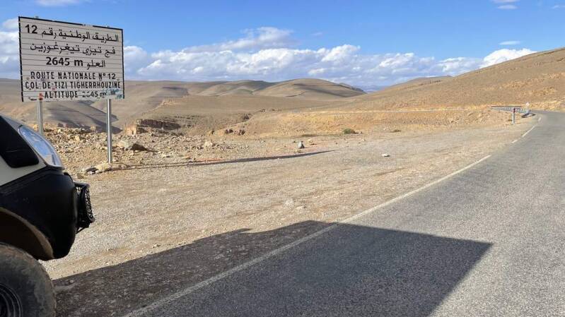 Die z.T. sehr enge Straße windet sich immer weiter nach oben. Dabei durchfahren wir mehrere kleine Dörfer mit ihren einfachen aber traditionell gebauten Lehmgebäuden. Wir erreichen den 2.645m hohen Pass „Tizi Tirherrhouzine“. In der Ferne sind bereits schon die schneebedeckten Gipfel des Hohen Atlas sehr gut zu erkennen.