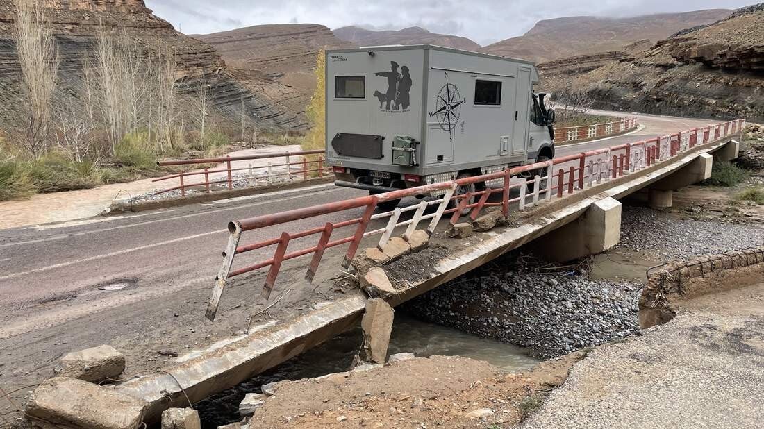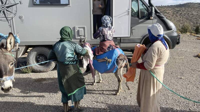 Die Felsenschluchten von „Cirque de Jaffar“ müssen wir leider auslassen. Der heftige Regen der letzten Tage hat dem Untergrund der Schlucht so zugesetzt, dass es momentan zu riskant wäre diese Passage zu befahren. Wir entscheiden uns für die nördliche Umfahrung. Dabei ergeben sich zudem sehr nette Begegnungen mit Einheimischen. Gerne werden von ihnen die mitgebrachten Kleidungsstücke entgegengenommen. Einen ruhigen Nachtplatz finden wir nahe der Schneegrenze des „Hohen Atlas“.