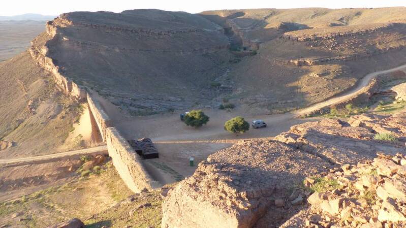 Unser nächstes Ziel liegt wieder etwas weiter draußen in der Wüste – Gara Medouara, das „Portugiesische Gefängnis“. Dabei handelt es sich um eine hufeisenförmige Felsformation, die an der Engstelle durch eine Mauer verschlossen wurde. Noch bis vor 200 Jahren wurden hier, in grausamer Art und Weise, Menschen als Sklaven für den Weitertransport in alle Welt zusammen getrieben. Auf einem Rundgang über die Felsen erhalten wir fantastische Ausblicke über die Wüste, bis hin zum "Erg Chebbi in der Ferne.