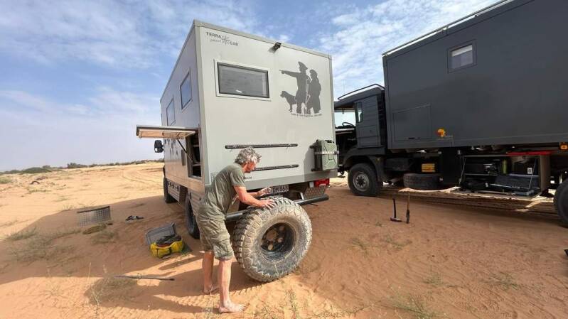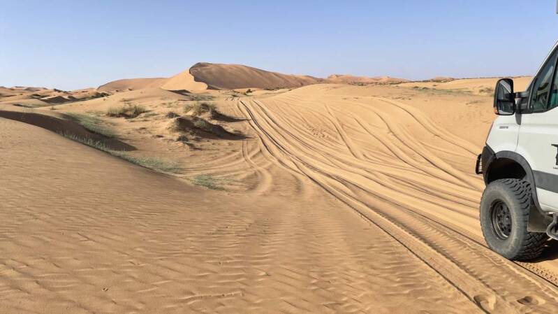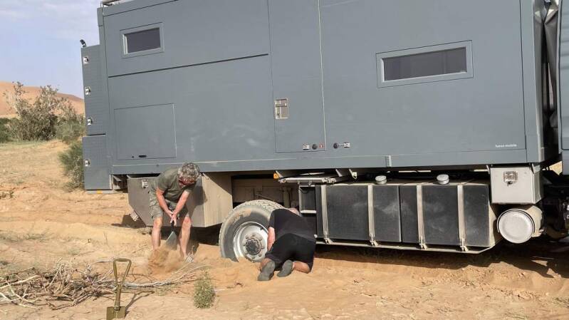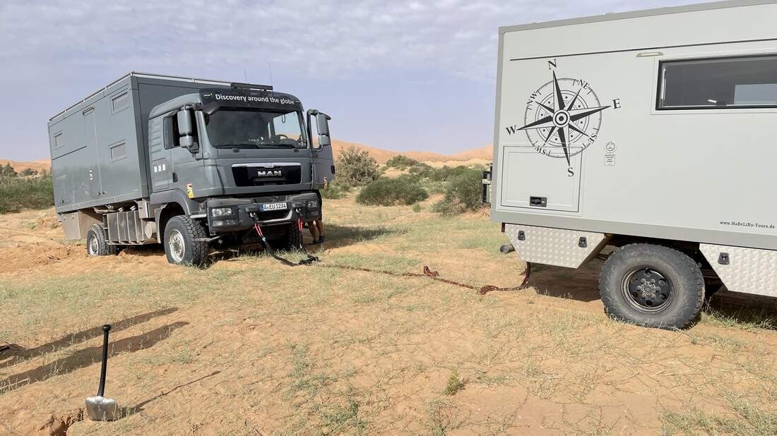 Trotz aller Aufmerksamkeit passiert es dann doch – nach einer engen und kurvigen Passage durch den Feinsand eines Wadis gräbt Robby sich ein. Doch mit vereinten Kräften und sportlicher Betätigung, können wir unsere Fahrt durch den Sandkasten fortsetzen.