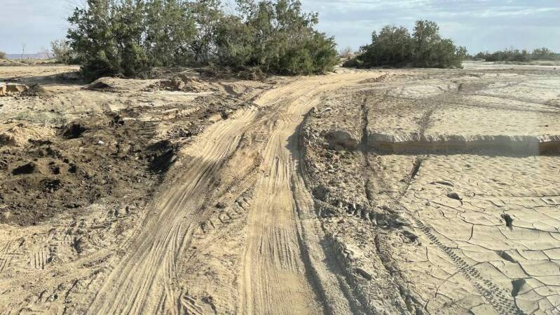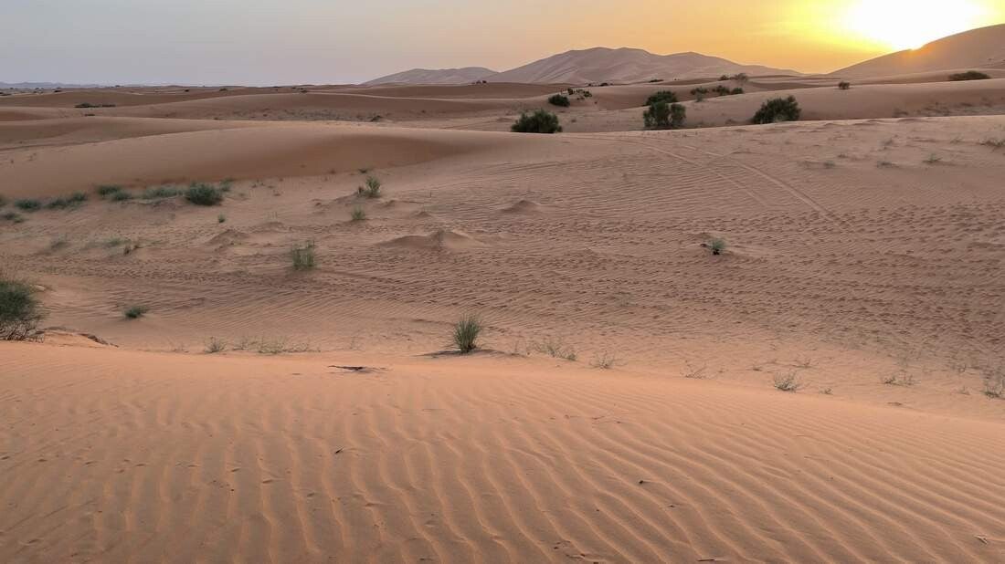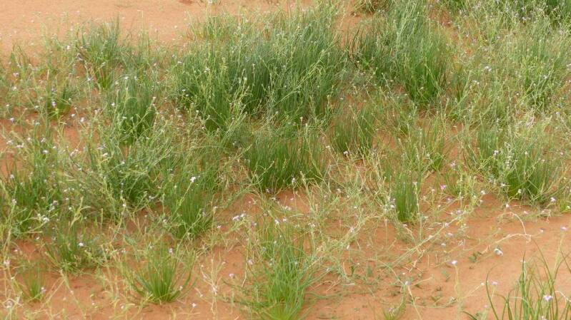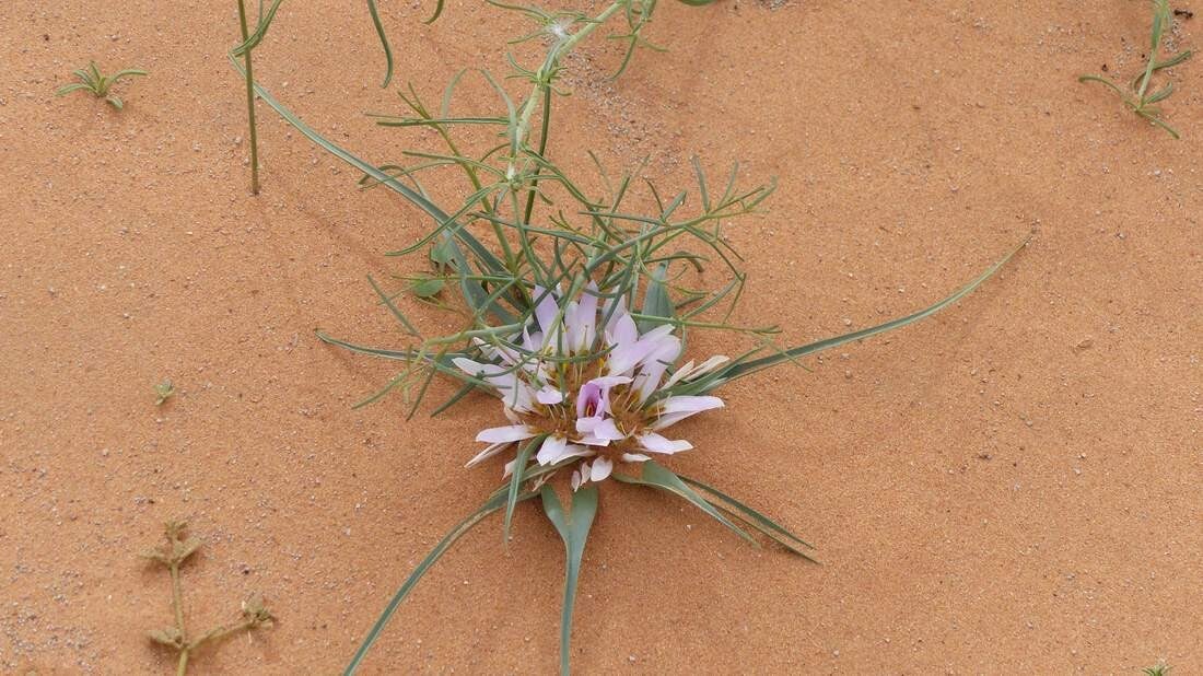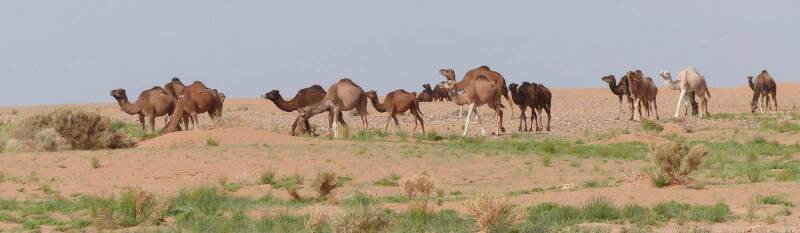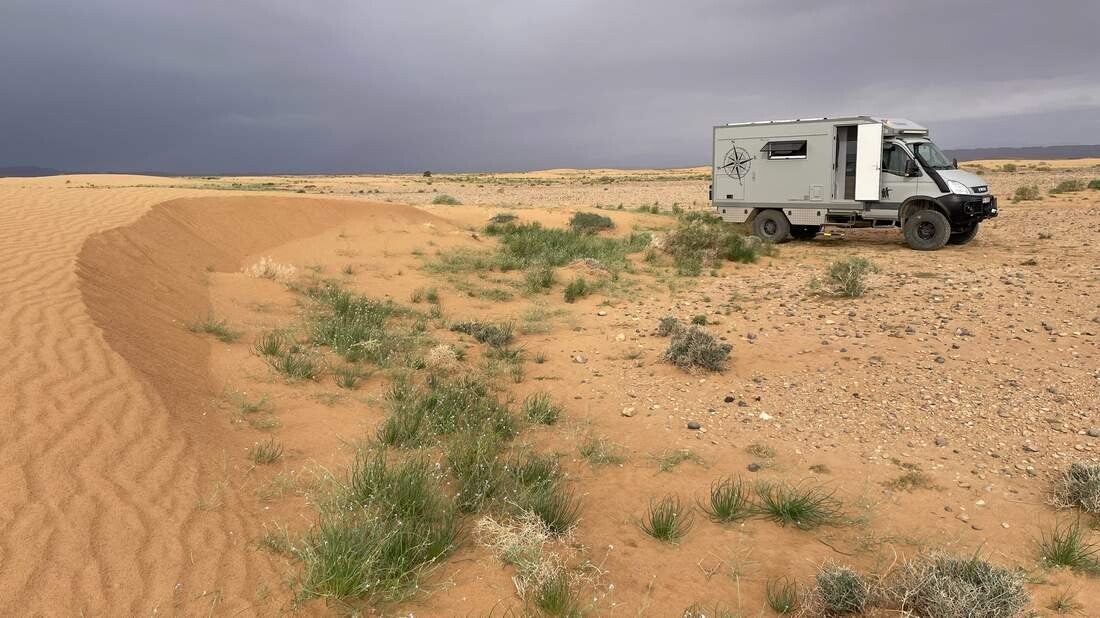 Es ist spät geworden. Für die anstehende Vollmondnacht stellen wir uns hinter eine kleine Sicheldüne. Bereits in der Nacht hat es immer wieder leicht geregnet und auch am Morgen sind die dicken Wolken noch nicht abgezogen. Doch der z.T. ergiebige Regen der letzten Wochen hat deutliche Spuren hinterlassen – es ist wirklich erstaunlich wie die Wüste blühen kann und zum Leben erwacht.