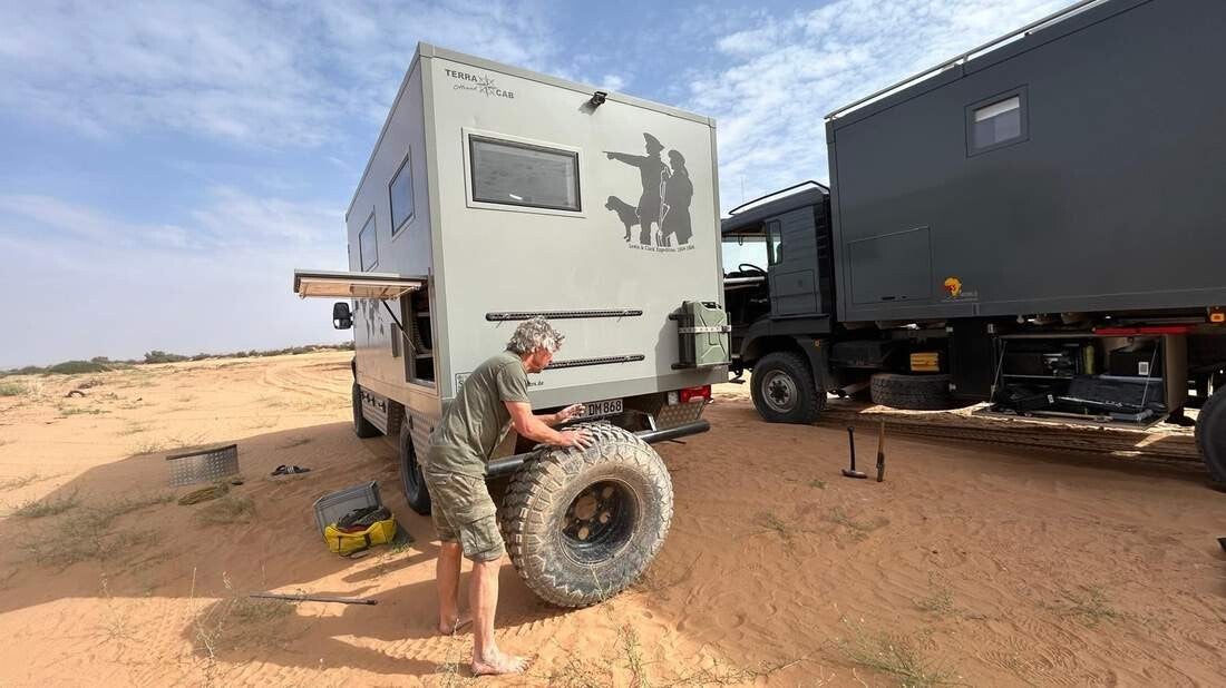 …noch nicht genug. Unmittelbar darauf zwingt uns ein Cut an der Außenseite des Hinterreifens zu einem Boxenstopp. Auch jetzt gilt: gemeinsam sind wir stark. In Rekordzeit ist der Reifen gewechselt und der Spielverderber unterm Fahrzeug montiert – weiter geht´s.