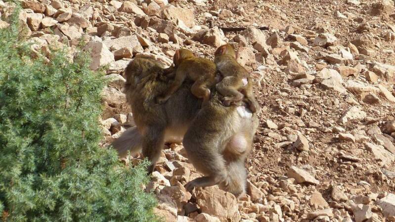 Auch hier treffen wir erneut neugierige Berberaffen an. Teilweise sind sie in großen Familienverbänden mit ihren Jungen unterwegs.