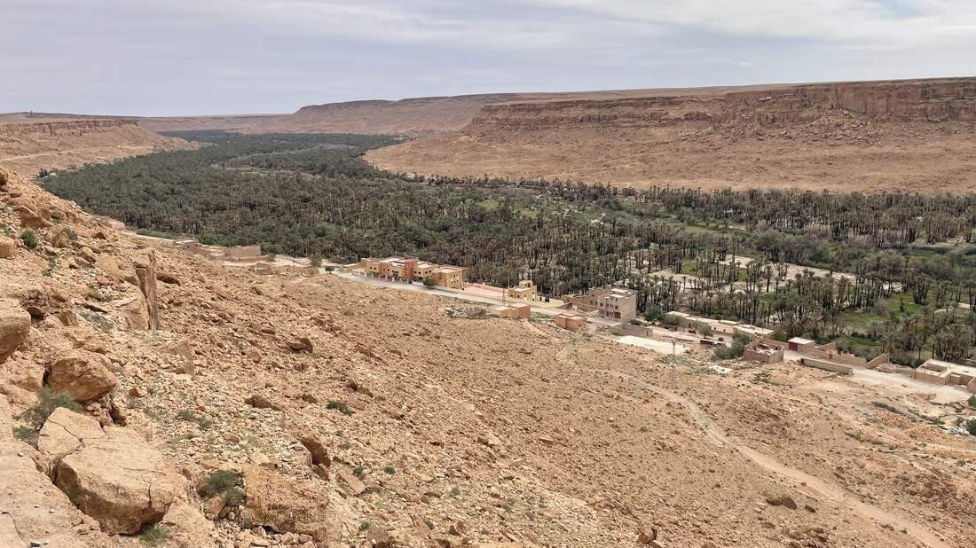 Wir folgen weiter dem Canyon des Oued Ziz und so nach und nach werden die mächtigen Felswände zu beiden Seiten immer flacher. Entlang seines unteren Laufes hat sich in der Vergangenheit ein beachtlicher Oasengürtel gebildet, der sich kilometerlang durch die Wüste schlängelt. Immer wieder sehen wir darin alte Lehmdörfer (s.g. Ksurs), die teilweise auch noch bewohnt sind.