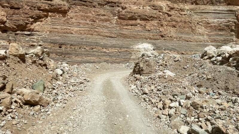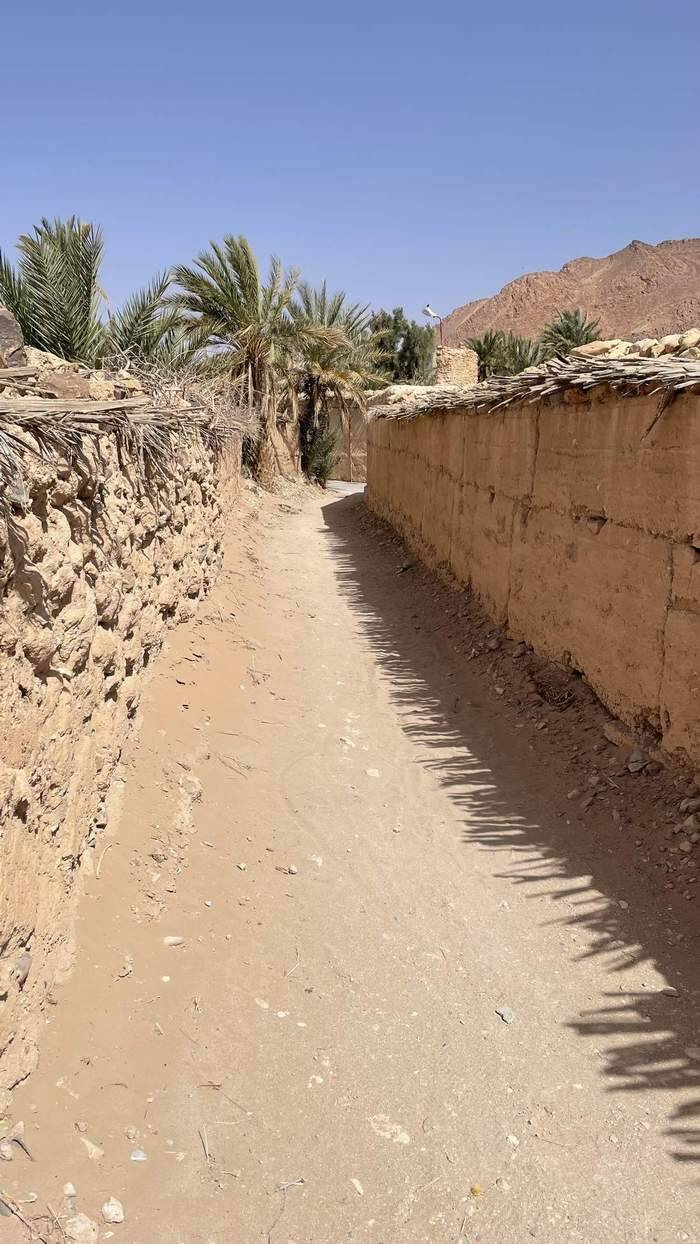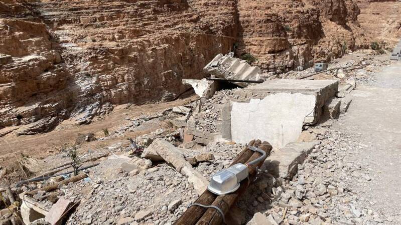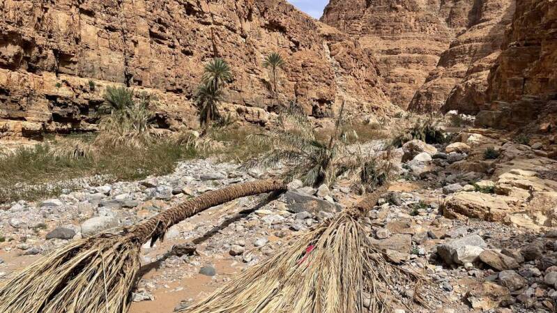 Auf einer kleinen von Geröll geräumten Fläche parken wir den Iveco, unmittelbar vor dem Dorf – besser ausgedrückt, von dem was noch steht. Mit einem flauen Gefühl im Magen gehen wir durch den Ort. Außer einem älteren Herrn und einem schreienden Esel ist niemand zu sehen – alles um uns herum wirkt sehr gespenstisch. Wir können aber auch erkennen, dass bereits an dem ein oder anderen Haus wieder begonnen wurde zu renovieren. Zumindest so, dass man notdürftig drin wohnen könnte. Am ersten Wadi unterhalb des Dorfes gibt es einen Durchbruch durch die Felswand, an dessen Ende sich ein tiefer gelegener Wadi befindet. Wer hier durchging, wurde früher mit einem traumhaften Blick auf eine Oase belohnt. Was sich uns jetzt bietet ist das Bild der Zerstörung, die die Schlamm- und Gerölllawine hinterlassen hat. Auf dem Rückweg bleibt bei uns das Gefühl von Hilflosigkeit und großer Demut.