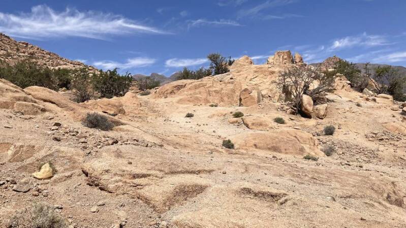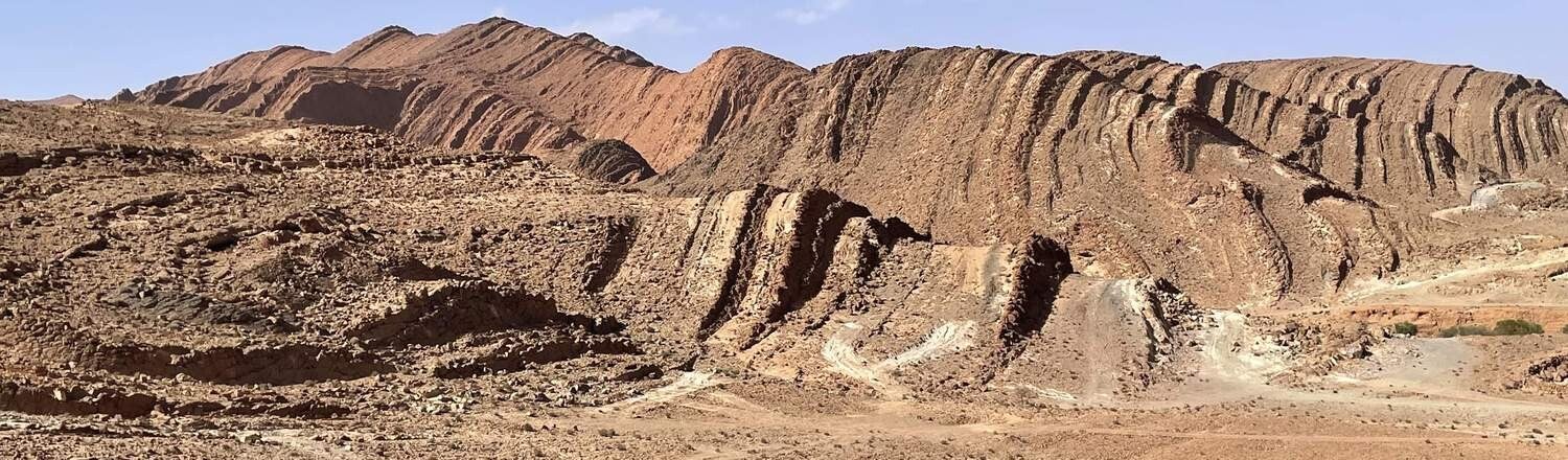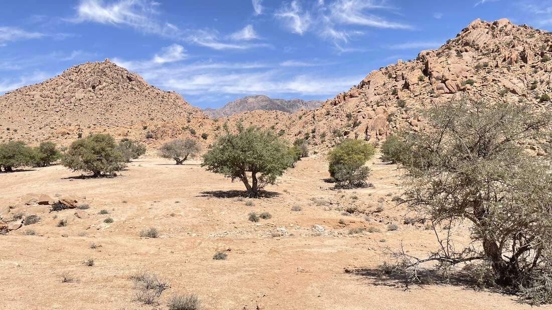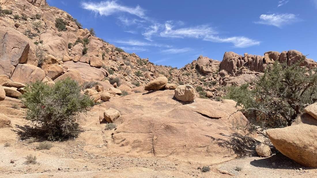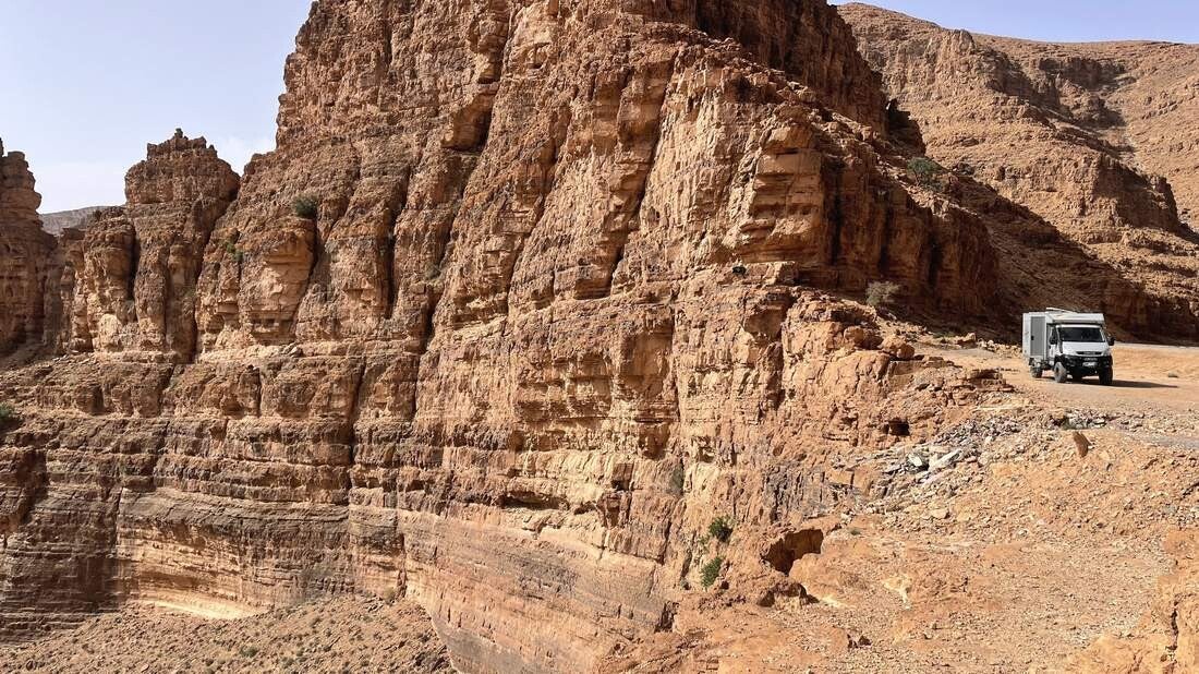 Vorbei an einem verfallenen Berberdorf sowie fantastischen Formationen die die Erdgeschichte hinterlassen hat, geht es weiter durch den Anti-Atlas. Für ein paar Tage verweilen wir etwas außerhalb von Tafraoute auf einem großen, wüstenähnlichen Areal. Es liegt am Fuße einer niederen Gebirgskette die zum Wandern geradezu einlädt. Mehrere kleine Wadis durchziehen das Gelände und auch ein paar schattenspendende Palmen sind vorhanden. Aufgrund der kurzen Distanz zum Ort erledigen wir zu Fuß unsere Einkäufe, lassen die gesamte Wäsche waschen und gehen mehrmals leckere Tajin essen – der Ramadan ging gerade vorüber.