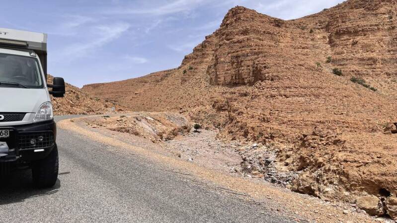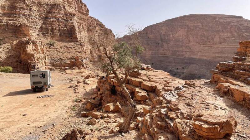 Nachdem wir die provisorische Schotterstraße wieder hinter uns haben, finden wir nur wenige Kilometer oberhalb von Aoukerda einen fantastischen Nachtplatz – die Aussicht in den davorliegenden Canyon ist einfach nur atemberaubend. Nichts deutet hier noch auf die Naturkatastrophe hin, die sich nur wenige Kilometer entfernt ereignet hat.