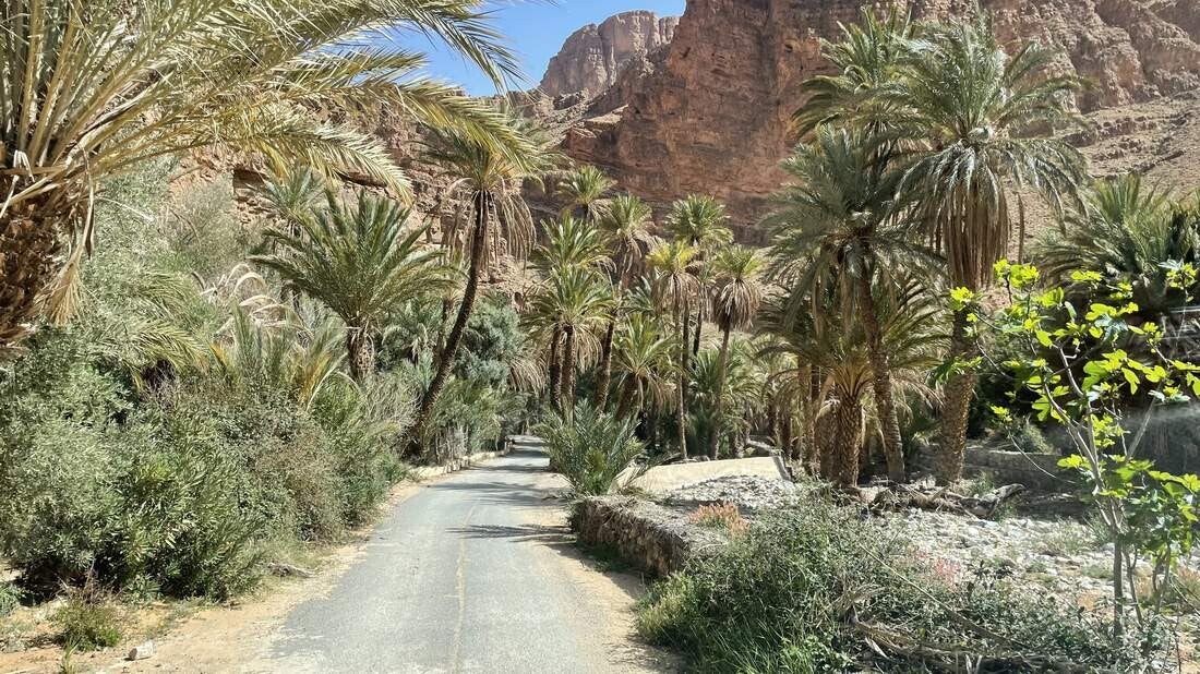 Auf der Fahrt nach Tafraoute, machen wir noch einen kleinen Schlenker durch den „Gorge d´Ait Mansour“. Zu Beginn schlängelt sich die schmale Straße über enge Serpentinen hinunter in die Schlucht. Dort erwartet uns eine wunderschöne Oase. Über viele Kilometer hinweg folgen wir jetzt der mit Dattelpalmen gesäumten Straße. Immer wieder können wir dabei Ausblicke auf die roten Felswände zu beiden Seiten erhaschen – herrlich.