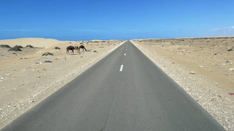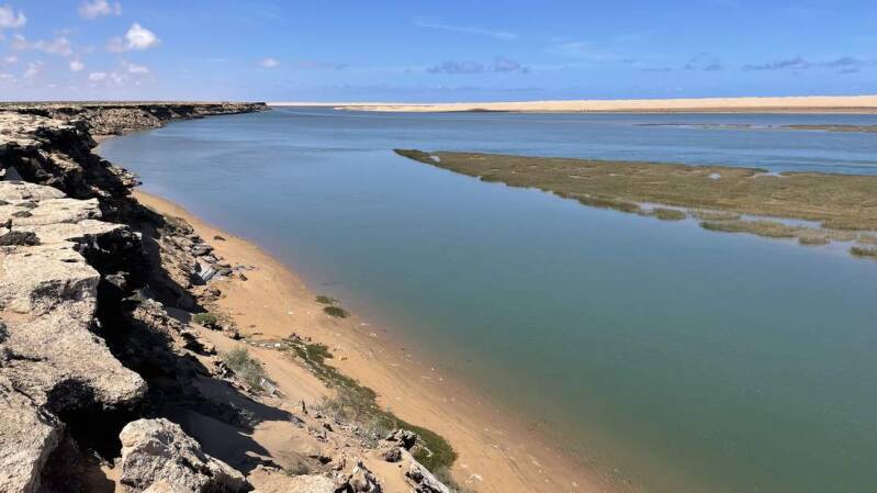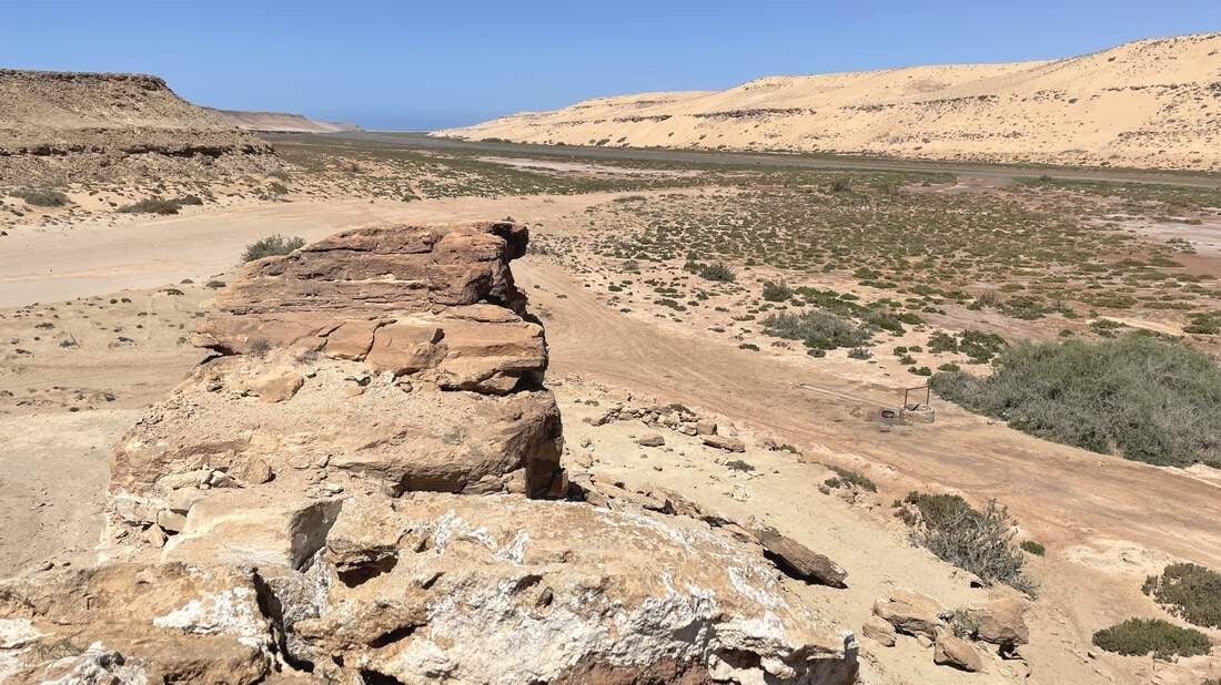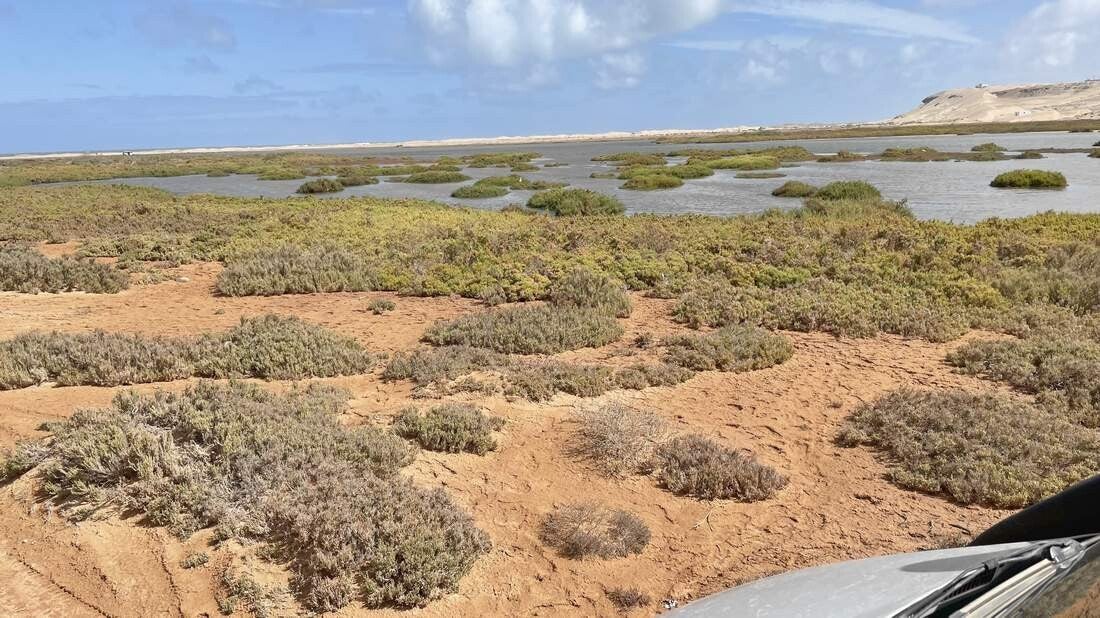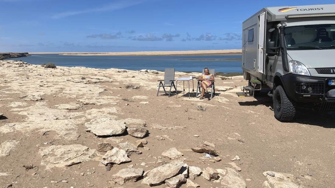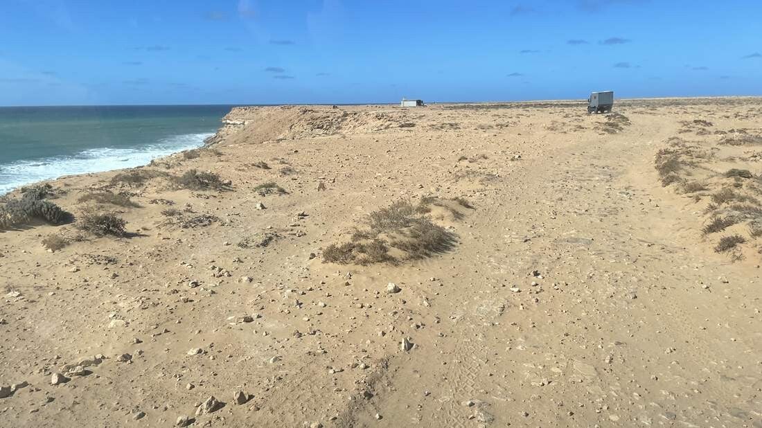 Ab Tarfaya ist die Straße 4-spurig und in einem Zustand, von dem wir in Deutschland nur träumen können. Bereits auf der Hinfahrt legten wir im „Khabta Nationalpark“ einen kurzen Stopp ein. Doch jetzt, wo im Norden des Landes immer noch die Schlechtwetterfront verbreitet ist, haben wir hier einen längeren Aufenthalt vorgesehen. Von unserem Platz aus können wir sehr gut den Gezeitenverlauf in der Bucht verfolgen. Ebenso machen wir schöne Wanderungen entlang der Steilküste. Leider sind so gut wie keine Zugvögel mehr zu sehen. Vermutlich sind sie schon längst wieder auf dem Weg nach Europa. Allerdings können wir uns von den lokalen Fischern das Abendessen schon mal „pfannenfertig“ vorbereiten lassen.