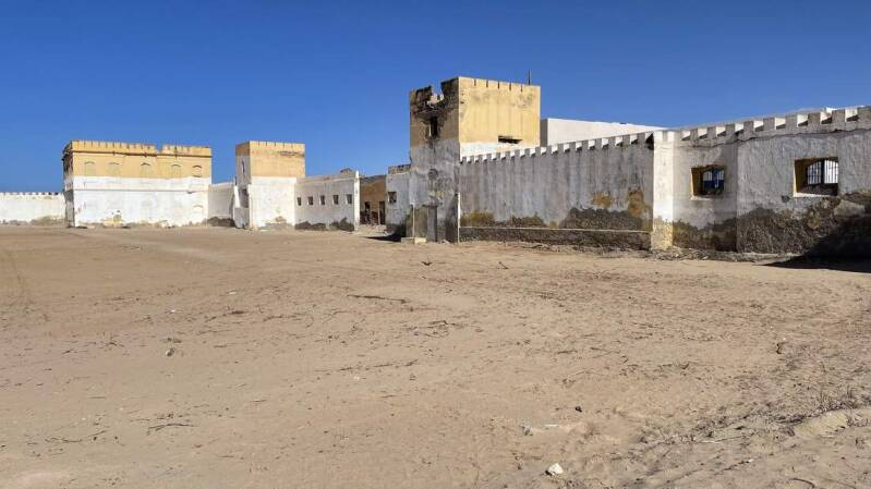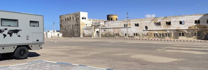 Nach einer ausgedehnten Mittagspause und einem kleinen Spaziergang durch die wunderschöne Dünenlandschaft, setzen wir unsere Reise fort. Tarfaya ist ein kleines Hafenstädtchen, das den Kanarischen Inseln bis auf etwa 120km nahe kommt. Nach wie vor hegen die Bewohner die Hoffnung, dass die Fährverbindung nach Fuerteventura wieder aufgenommen wird und so der Stadt etwas Wohlstand zurückbringt. Bereits 2016 gab es diese Verbindung schon einmal, die allerdings nach wenigen Wochen wieder eingestellt wurde. Wir parken den Iveco neben der ehemaligen französischen Bastion, die leider dem Verfall preisgegeben ist.