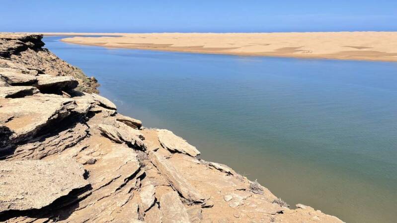 Von El Ouatia aus fahren wir an die Mündung der „Draa“. Hier mündet der mit etwa 1.100km längste Fluss Marokkos in den Atlantik. Nur wenige Wochen im Jahr, wenn der Fluss nach heftigen Regenfällen auch durchgehend Wasser führt, kommt hier überhaupt etwas an. Von oben erhalten wir tolle Einblicke zu beiden Seiten in das Draa-Tal. Während einer kleinen Wanderung an der Mündung des Flusses entdecken wir auch wieder ein kleines Wrack, das allerdings schon zur Hälfte im Sand verschwunden ist. Auch hier sind von den vielen Zugvögeln, die im Frühjahr eine Rast auf ihrer Reise in den Norden machen, leider keine mehr anzutreffen.