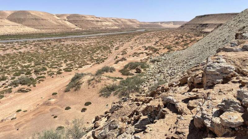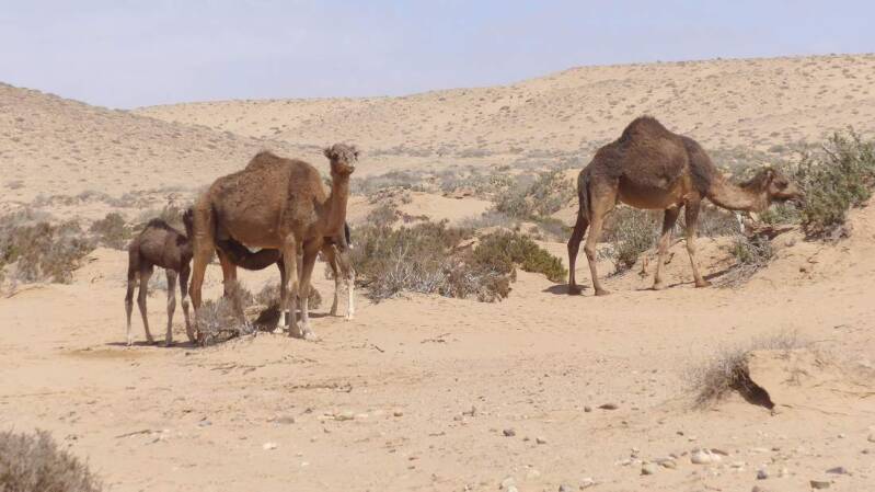 Auch wir machen uns mit Reisebekannten auf den Weg an die Steilküste des Plage Blanche. Hauptsächlich geht es über Sand- und Schotterpisten durch Teile des trockenen Flussbetts der Draa. Dabei legen wir nicht nur Fotostopps für wilde Esel und neugierige Kamele ein, sondern gehen auch zum Einsammeln von nicht alltäglichen „Souvenirs“ vom Gas. Begleitet werden wir von einem permanenten Starkwind, der die Sicht z.T. doch sehr einschränkt.