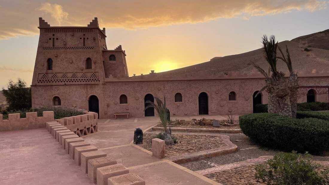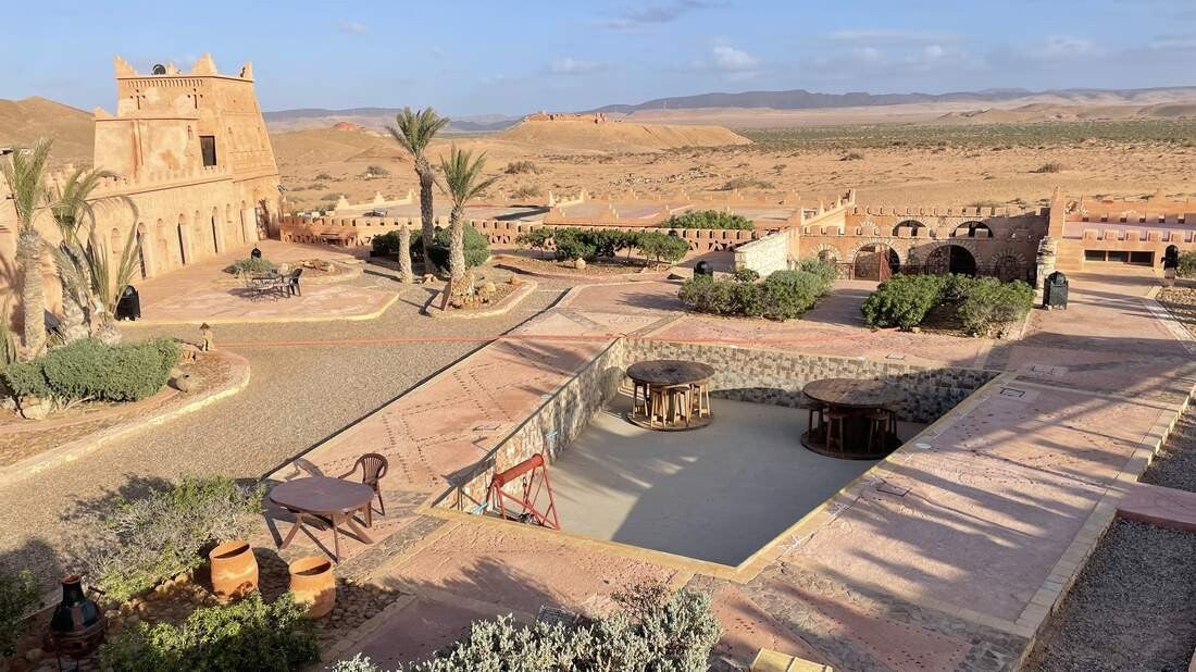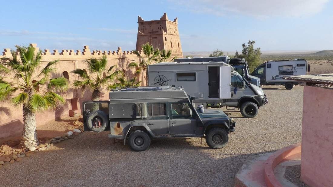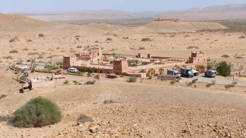 Unser nächstes Ziel ist die andere Seite der „Draa Mündung“. Hierfür folgen wir ein langes Stück dem Fluss, bis wir auf eine Brücke treffen. Auf dem Weg zur Küste übernachten wir in dem wunderschönen „Ksar Tafnidilt“, der allerdings nur über eine Sandpiste zu erreichen ist. Unübersehbar ist auch, dass hier vor nicht allzu langer Zeit noch das Wasser stand. Als „Ksar“ werden mehrere und zusammenhängende Wohneinheiten im berberischen Stil bezeichnet, die mit einer Lehmmauer umzogen sind. Die sehr stilgetreu restaurierte Anlage, beinhaltet neben mehreren Hotelzimmern und einem Restaurant mit Bar, auch eine größere Stellfläche für Camper. So treffen sich hier viele Offroader die an den „Plage Blanche“ fahren wollen oder von dort kommen.