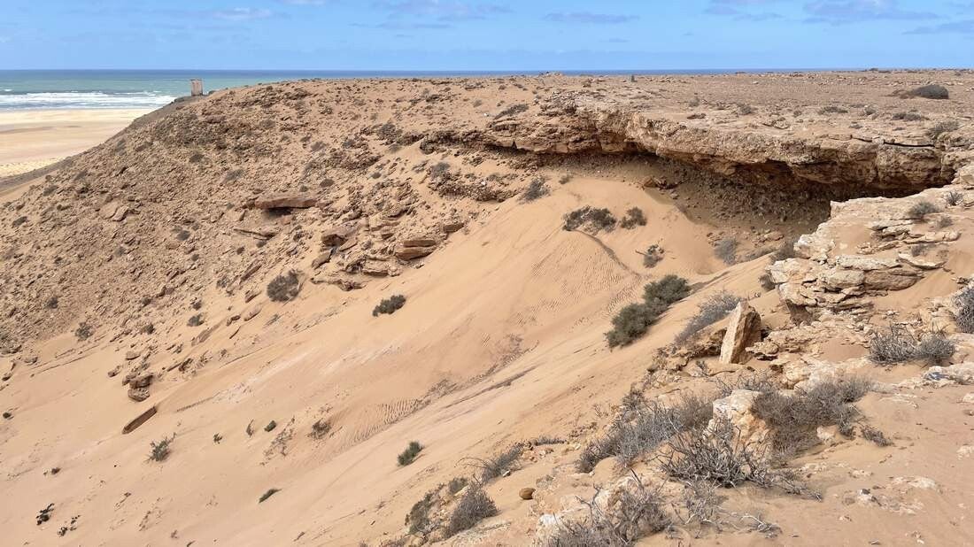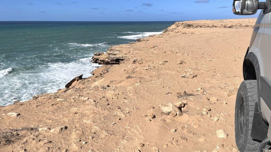 Ab der „Draa Mündung“ folgen wir jetzt der teilweise sehr schroffen Steilküste gen Norden. In regelmäßigen Abständen passieren wir dabei Militärposten, die sich allerdings nicht sonderlich für uns interessieren. Etwas problematischer hingegen stellen sich die frischen und ständig wandernden Sanddünen für uns heraus. Nicht nur, dass sie den Weg unpassierbar machen, sie zwingen uns des Öfteren auch zur Suche nach neuen Tracks.