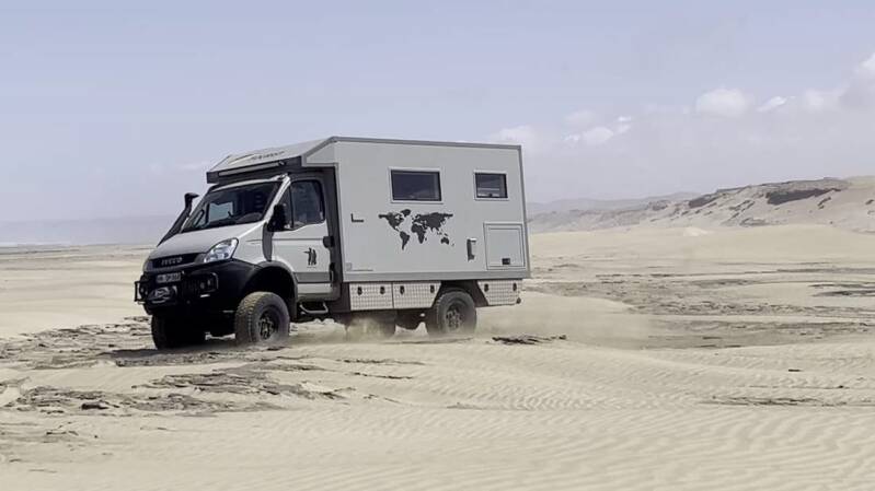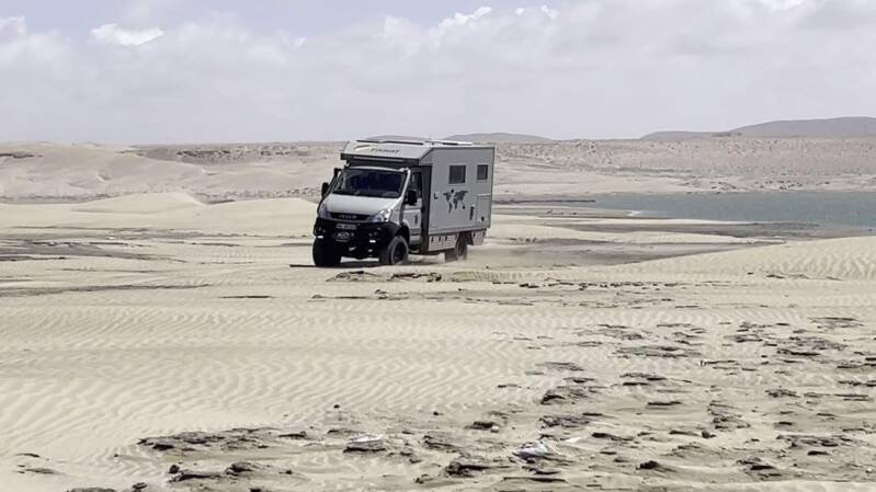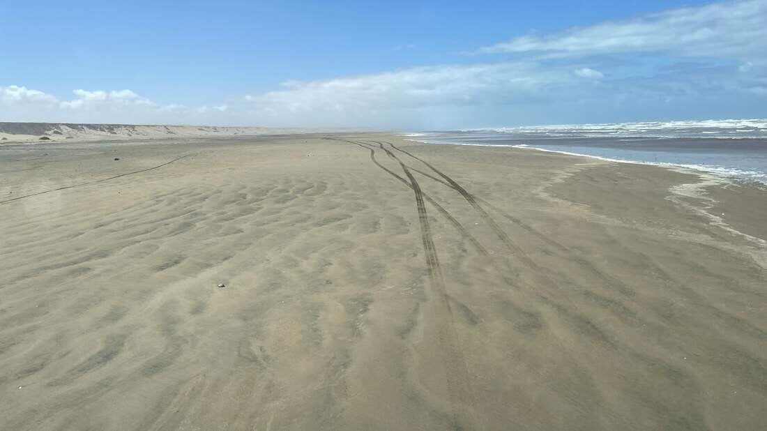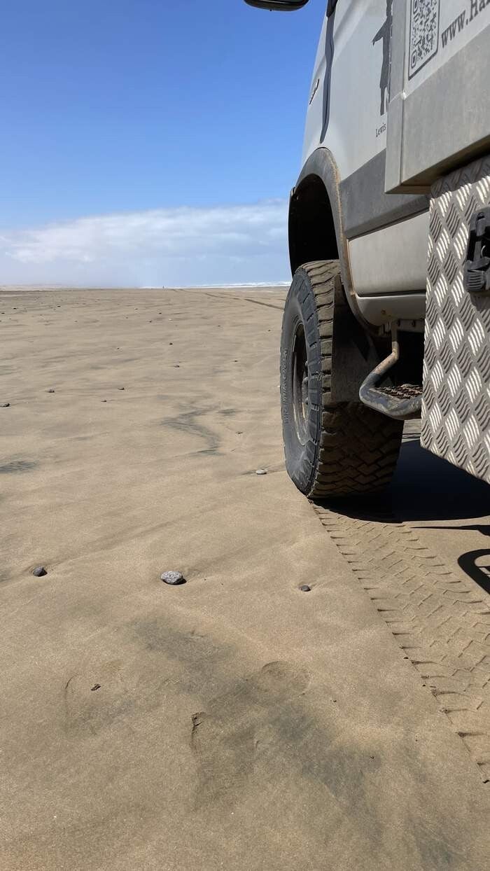 Beim starkem Wind kommen wir am Plage Blanche, dem "Weißen Strand", an. Die anstehende Nacht verbringen wir windgeschützt hinter ein paar großen Felsen in einem trockenen Flussbett. Nachdem sich am Morgen der starke Wind einigermaßen gelegt hat, warten wir auf den geeignetsten Zeitpunkt um auf den Strand fahren zu können. Idealerweise liegt der hier bei etwa 90 Minuten vor der Ebbe. So bliebe jedem Fahrer genügend Zeit, sich im Falle eines „Eingrabens“ im Sand, vor der auflaufenden Flut noch zu befreien. Zunächst reduzieren wir den Reifendruck und suchen uns dann die perfekte Zufahrt über die davorliegenden Dünen. Mit eingelegter Untersetzung und Mittelsperre fahren wir jetzt mit viel Schwung und erhöhter Drehzahl auf den Strand hinaus.