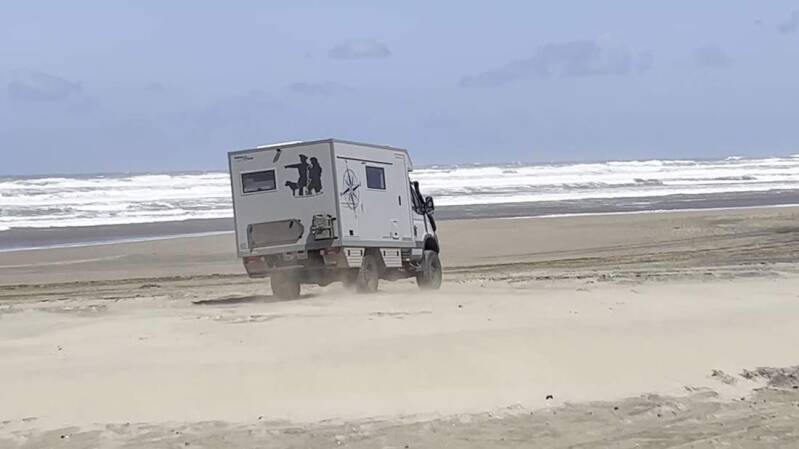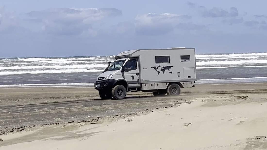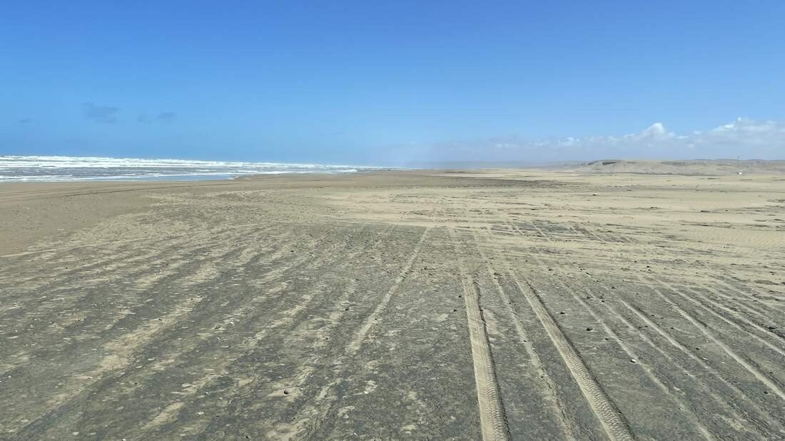 Nun gilt es, die ideale Fahrspur zu finden. Diese befindet sich in aller Regel dort, wo der Sand am härtesten ist und am besten das Gewicht des Fahrzeuges trägt. Über mehrere Kilometer folgen wir jetzt dem doch recht unterschiedlich beschaffenen und tragenden Küstenabschnitt. Anders noch wie in Texas, als wir 2019 den Strand von „Corpus Christi“ befuhren, gibt es hier immer wieder Weichsandpassagen. Leider sind die nicht immer sofort zu erkennen. Nach etwa 30 Minuten haben wir genug im „Sandkasten“ gespielt und fahren dieselbe Strecke wieder zurück. Nach dem anfänglich doch etwas erhöhten Adrenalinausstoß, übernimmt jedoch sehr schnell der Spaßfaktor die Oberhand.
