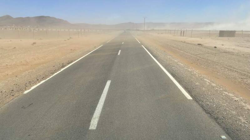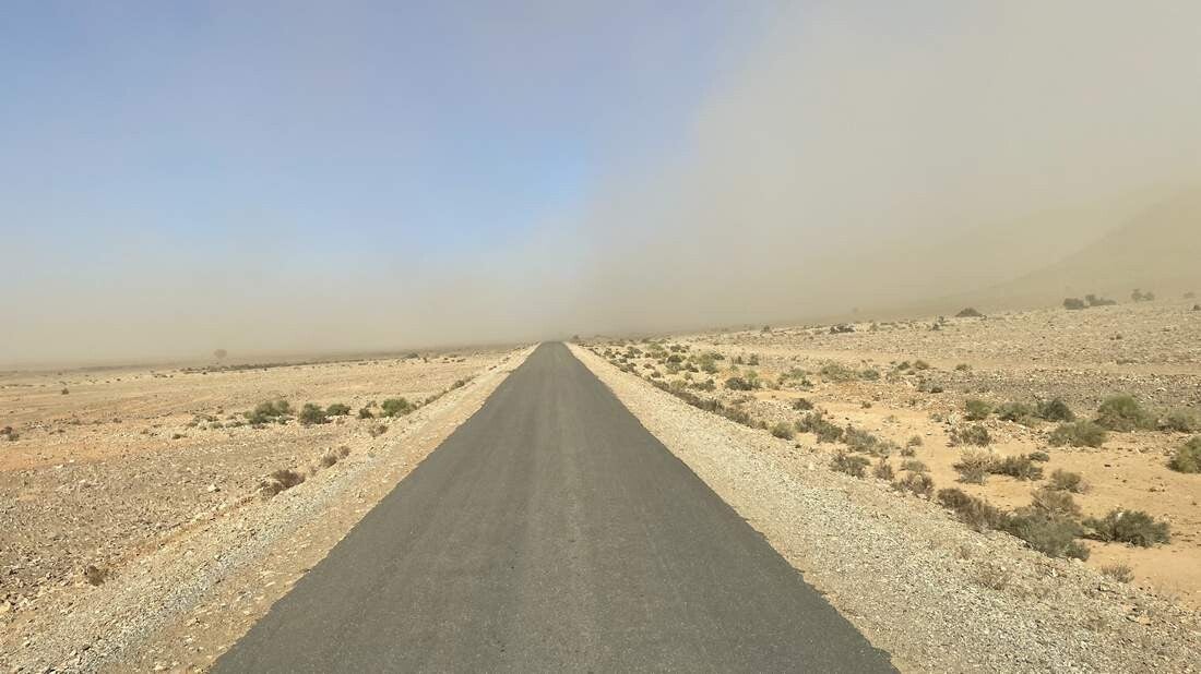 Knapp hinter der Küste treffen uns erneut die Sandstürme, die teilweise nicht nur die Fahrt erschweren, sondern auch die Sicht deutlich verringern. Doch ab Guelmim legt sich so langsam der Wind wieder und wir können die Fahrt durch die ersten Ausläufer des "Anti-Atlas" bei bester Sicht genießen.