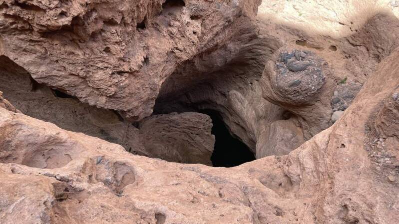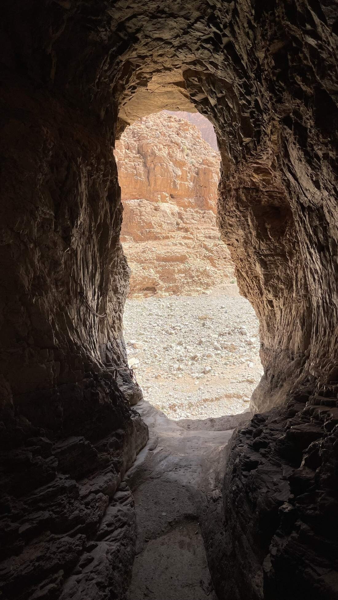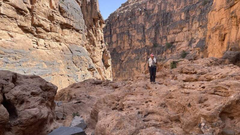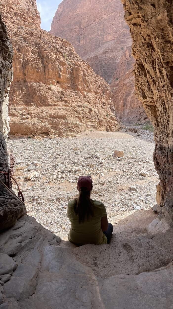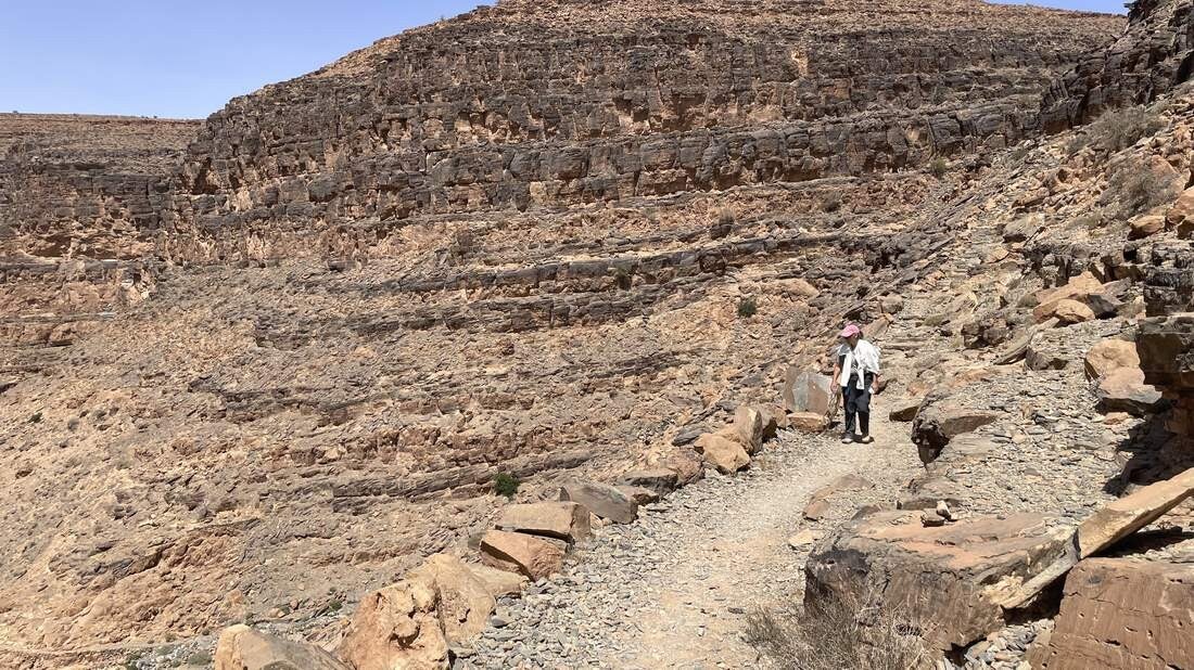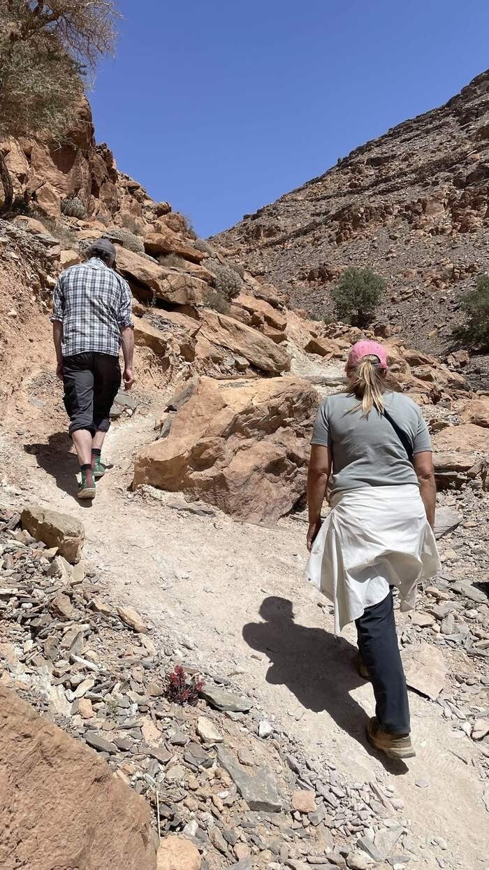 Am nächsten Tag machen wir uns auf den Weg in den „Amtoudi Canyon“. Vorbei an dem gleichnamigen Dorf folgen wir dem Wadi immer tiefer in die Schlucht hinein. Unübersehbar, dass hier das herabstürzende Wasser und das Geröll seine Spuren hinterlassen hat. Über mehrere Kilometer geht es nun stetig nach oben. Flankiert wird der Canyon von fast hundert Meter hohen Wänden die im weiteren Verlauf immer enger werden. Im oberen Bereich sind sehr gut die ausgespülten Felsen mit ihren tiefen Löchern zu sehen, die die Kraft des Wasser in Jahrtausenden hinterlassen hat.